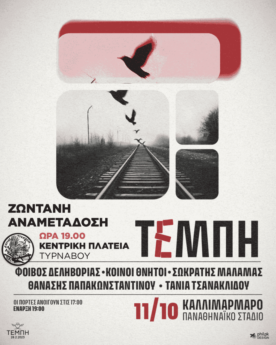 Ο Δήμος Τυρνάβου, σε ένδειξη σεβασμού στη μνήμη των θυμάτων του τραγικού δυστυχήματος των Τεμπών, ανακοινώνει τη ζωντανή μετάδοση της συναυλίας μνήμης που θα πραγματοποιηθεί σήμερα, Παρασκευή 11 Οκτωβρίου 2024, στο Καλλιμάρμαρο Παναθηναϊκό Στάδιο.