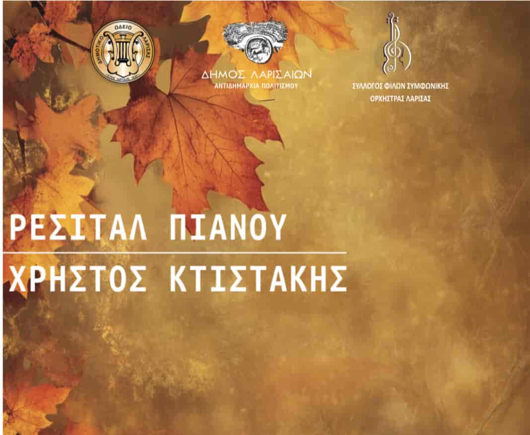 Ρεσιτάλ πιάνου με τον διακεκριμένο μαέστρο της Συμφωνικής Ορχήστρας Λάρισας, Χρήστο Κτιστάκη διοργανώνει η Αντιδημαρχία Πολιτισμού Δήμου Λαρισαίων, το Δημοτικό Ωδείο Λάρισας και ο Σύλλογος Φίλων της Συμφωνικής Ορχήστρας Λάρισας, το Σάββατο 2 Νοεμβρίου, στις 8:00 μ.μ. στην αίθουσα συναυλιών του Δημοτικού Ωδείου Λάρισας.