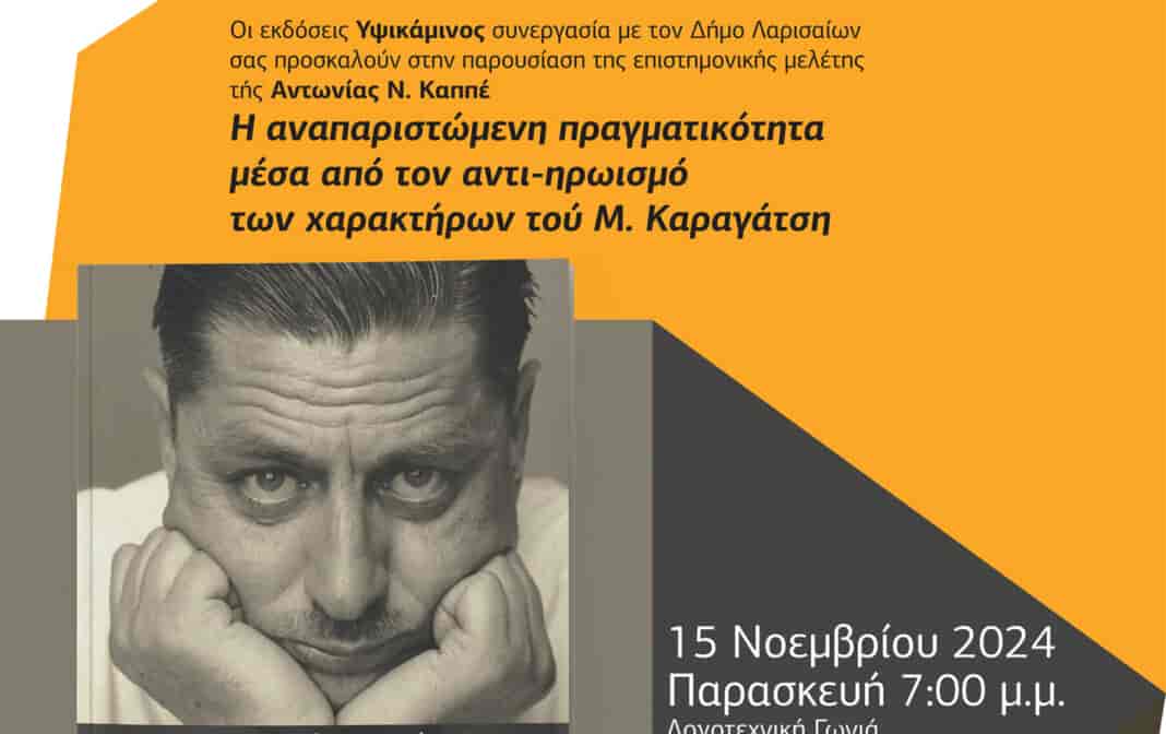 Παρουσιάζεται την Παρασκευή 15 Νοεμβρίου 2024, στις 7:00 το απόγευμα, στην Λογοτεχνική Γωνιά (Γαληνού και Φαρμακίδου γωνία), το μελέτημα της Αντωνίας Ν. Καππέ με τίτλο: «Η αναπαριστώμενη πραγματικότητα μέσα από τον αντι-ηρωισμό των χαρακτήρων του Μ. Καραγάτση» από τις εκδόσεις Υψικάμινος. Η παρουσίαση του βιβλίου γίνεται σε συνεργασία με την Αντιδημαρχία Πολιτισμού του Δήμου Λαρισαίων, τον Μορφωτικό Σύλλογο Ραψάνης και το βιβλιοπωλείο Πρίσμα.