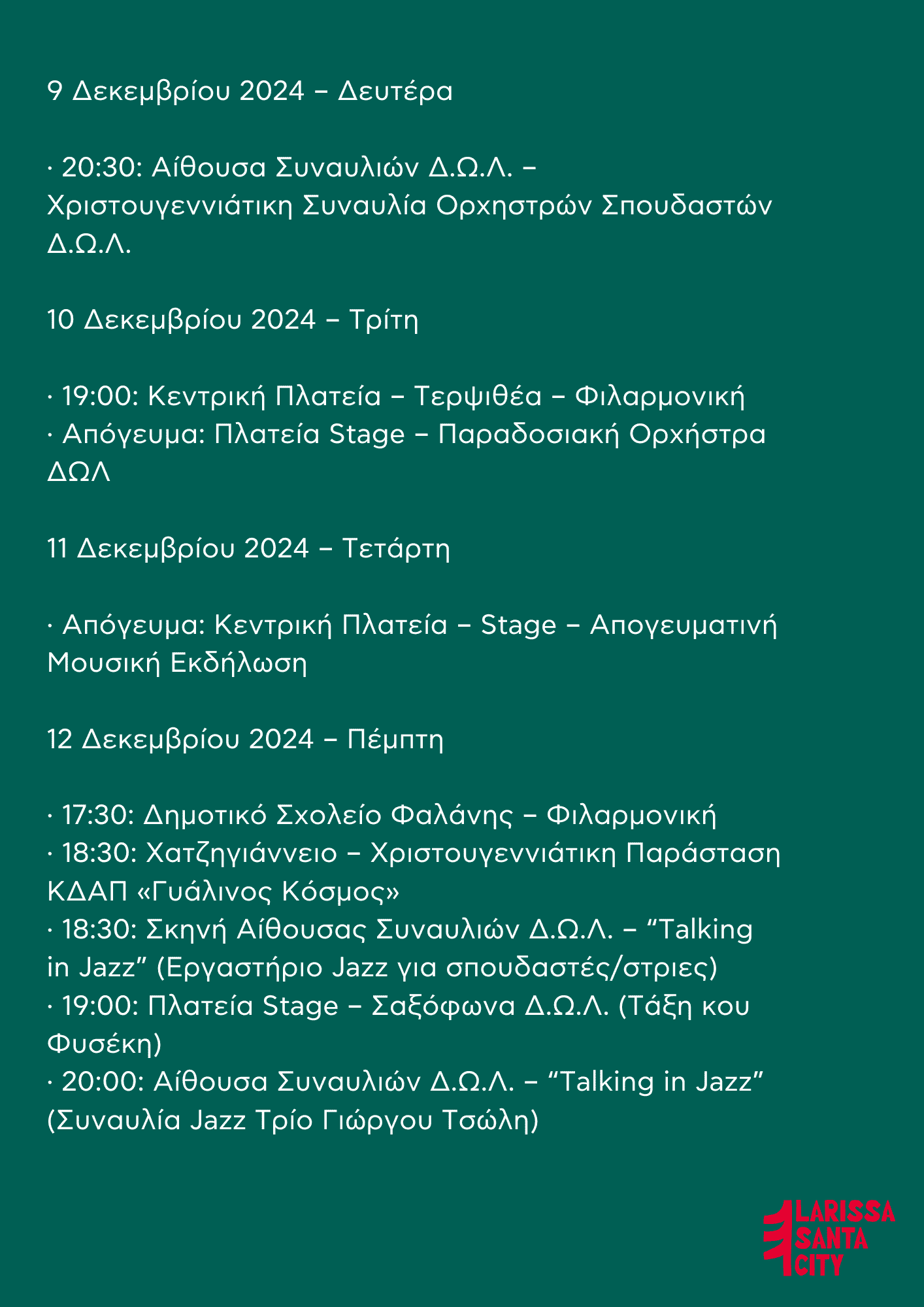 - 9:00: Πόλη της Λάρισας – Κάλαντα από Φιλαρμονική