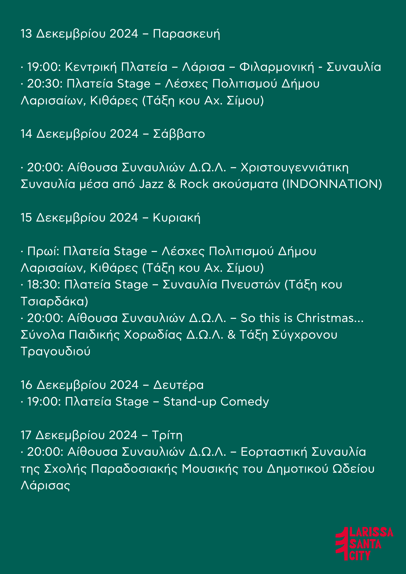 Πρόγραμμα Εκδηλώσεων Δήμου Λαρισαίων – Χριστούγεννα 2024 & Πρωτοχρονιά 2025