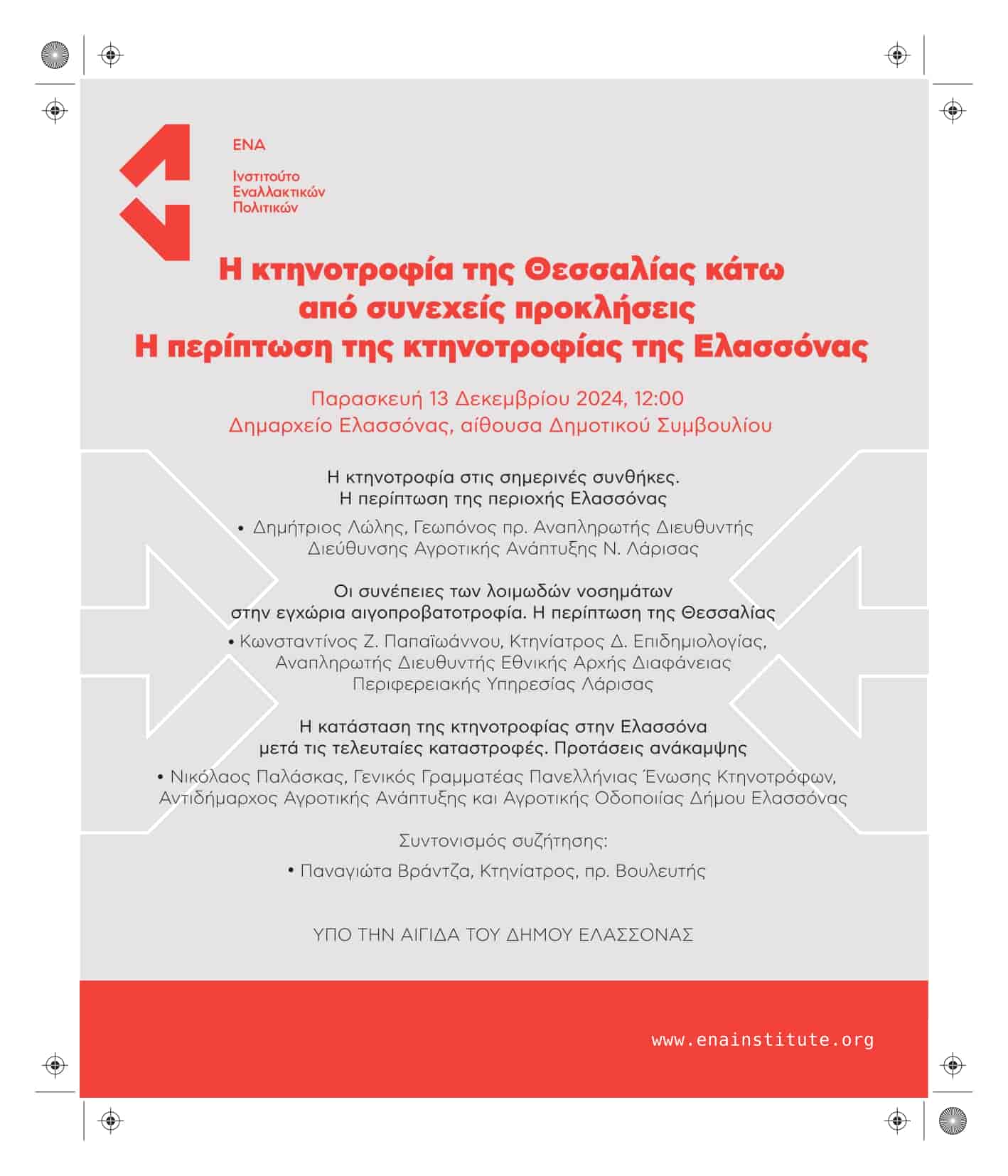 Η εκδήλωση διοργανώνεται από το Παράρτημα Θεσσαλίας του Ινστιτούτου Εναλλακτικών Πολιτικών ΕΝΑ υπό την αιγίδα του Δήμου Ελασσόνας. Καλούνται όλοι οι ενδιαφερόμενοι να συμμετάσχουν και να πάρουν μέρος στη συζήτηση που θα ακολουθήσει.