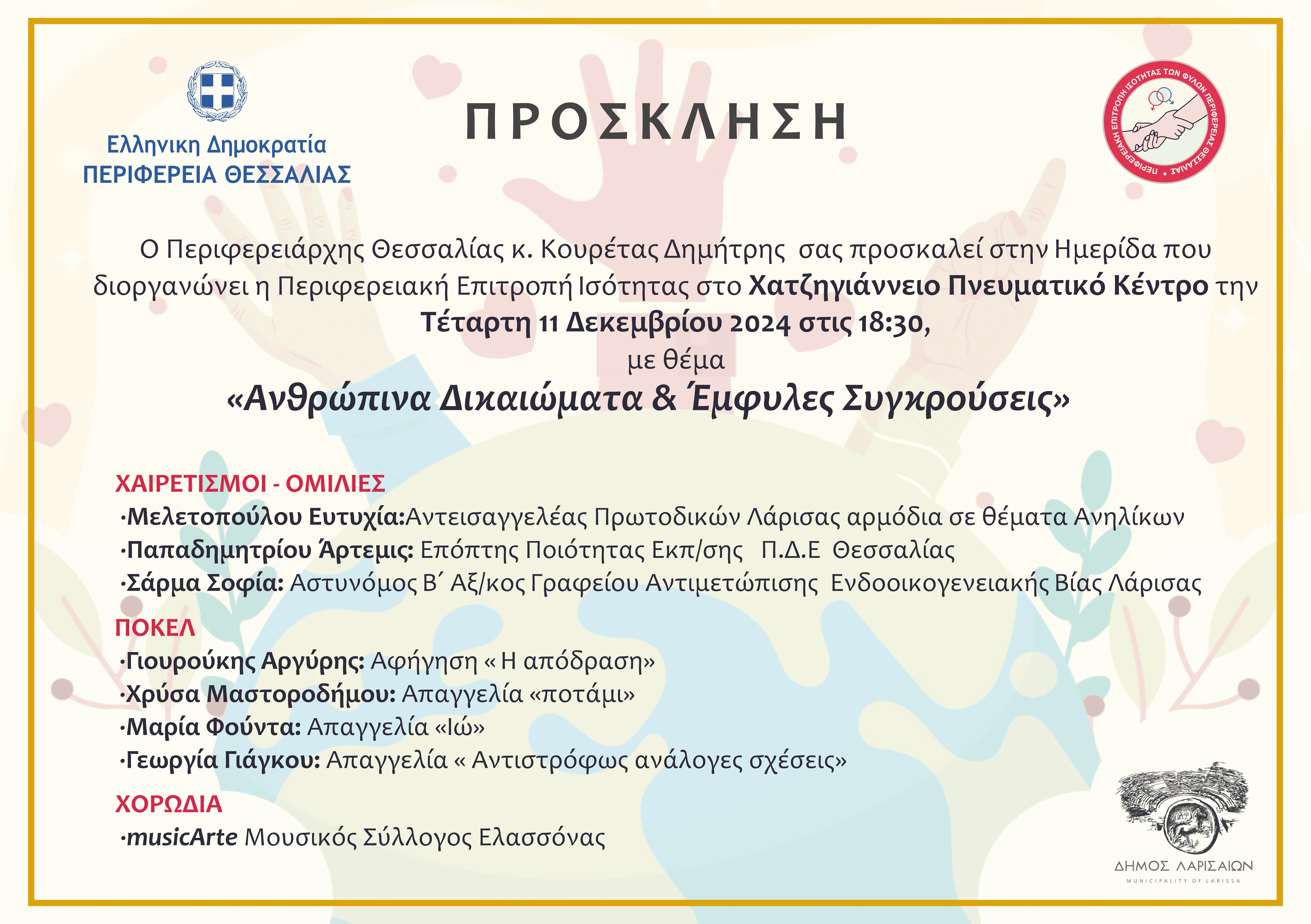 Η Περιφέρεια Θεσσαλίας και η Επιτροπή Ισότητας σας προσκαλούν να παρακολουθήσετε την Ημερίδα με τίτλο «Ανθρώπινα Δικαιώματα και Έμφυλες Συγκρούσεις», η οποία θα πραγματοποιηθεί την Τετάρτη, 11 Δεκεμβρίου 2024, στις 18:30, στο Χατζηγιάννειο Πνευματικό Κέντρο, στη Λάρισα.