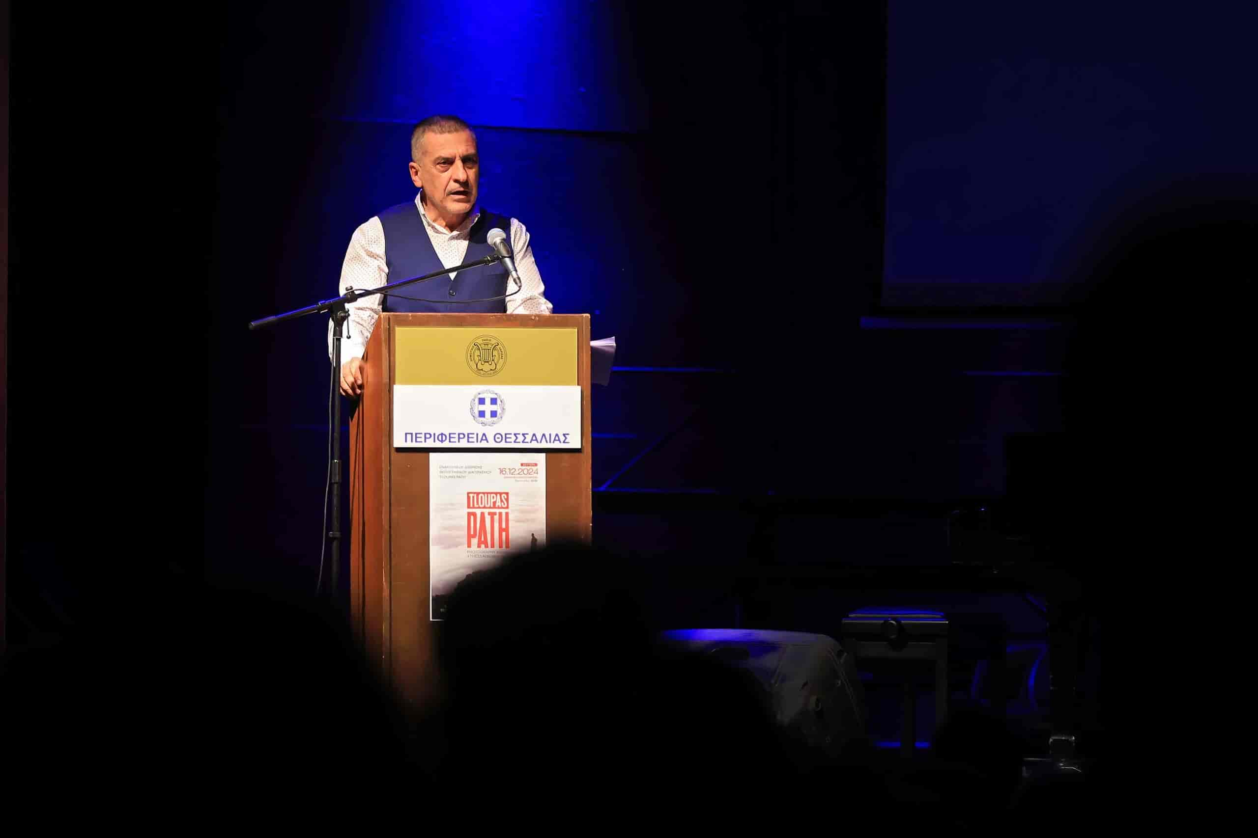 Ακολούθησε η ομιλία του Δημήτρη Κουρέτα, ο οποίος ανέφερε ότι «ως Περιφέρεια Θεσσαλίας αναγγείλαμε μια σειρά από σημαντικές δράσεις και πρωτοβουλίες. Με ιδιαίτερη χαρά μπορώ σήμερα να ανακοινώσω πως όλα όσα συζητήσαμε κι υποσχεθήκαμε πραγματοποιήθηκαν – μάλιστα έγιναν πολύ περισσότερα από όσα είχαμε δεσμευτεί πως θα δημιουργήσουμε. Μια εξαγγελία μας, πολύ σημαντική, κορυφαία μπορώ να πω, την αφήσαμε για το τέλος του χρόνου, για να την γιορτάσουμε μαζί. Πρόκειται για τον διεθνή φωτογραφικό διαγωνισμό, αφιερωμένο στον μεγάλο Θεσσαλό (και Λαρισαίο) φωτογράφο Τάκη Τλούπα, ο οποίος έχει καθορίσει το «βλέμμα» μας, την οπτική με την οποία κατανοούμε την Θεσσαλία ως τοπίο Πολιτιστικό, Κοινωνικό αλλά και Παραγωγικό. Ευχαριστώ από καρδιάς την Βάνια Τλούπα για την ευγενική και γενναιόδωρη συμπαράσταση της στην προσπάθεια μας όπως και όλους όσους εργάστηκαν για την πραγματοποίηση του TLOUPAS PATH (Tloupas Photography Award of Thessaly’s Heritage – Τλούπας Βραβείο Φωτογραφίας της Θεσσαλικής Πολιτιστικής Κληρονομιάς) – μου άρεσε και το λογοπαίγνιο που κρύβει ο τίτλος, αφού path σημαίνει μονοπάτι, δρόμος, κατεύθυνση, κι εμάς μας αρέσει να ανοίγουμε δρόμους σε όλα τα πεδία, στον Πολιτισμό, στην Παραγωγή, στην Κοινωνική ζωή, στην Πρόνοια για το κοινό καλό. Προσωπικά στηρίζω με ενθουσιασμό τον Πολιτισμό κι έχω μεγάλο σεβασμό κι αγάπη στις Τέχνες. Η σημερινή βραδιά φιλοξενεί μια ακόμη δημιουργική πρωτοβουλία της Περιφέρειας, την ενίσχυση της κινηματογραφίας, με το εξαίρετο ντοκιμαντέρ σε εξέλιξη, με τίτλο «ΘΕΣΣΑΛΙΑ ΕΚ ΤΩΝ ΕΣΩ» , εμπνευσμένο από τα πρόσφατα τρομερά γεγονότα των πλημμυρών του Daniel, σκηνοθετημένο από τον λαμπρό κινηματογραφιστή Πάνο Καρκανεβάτο. Επίσης, έχει ήδη ανακοινωθεί από το τμήμα Πολιτισμού η πλήρης ενεργοποίηση του Film Office της Περιφέρειας Θεσσαλίας, ενός θεσμού που βοηθά και στηρίζει κάθε πρωτοβουλία που αφορά την δημιουργική κινηματογραφική δραστηριότητα στην Θεσσαλία, την φιλοξενία παραγωγών ταινιών, σίριαλ κλπ».