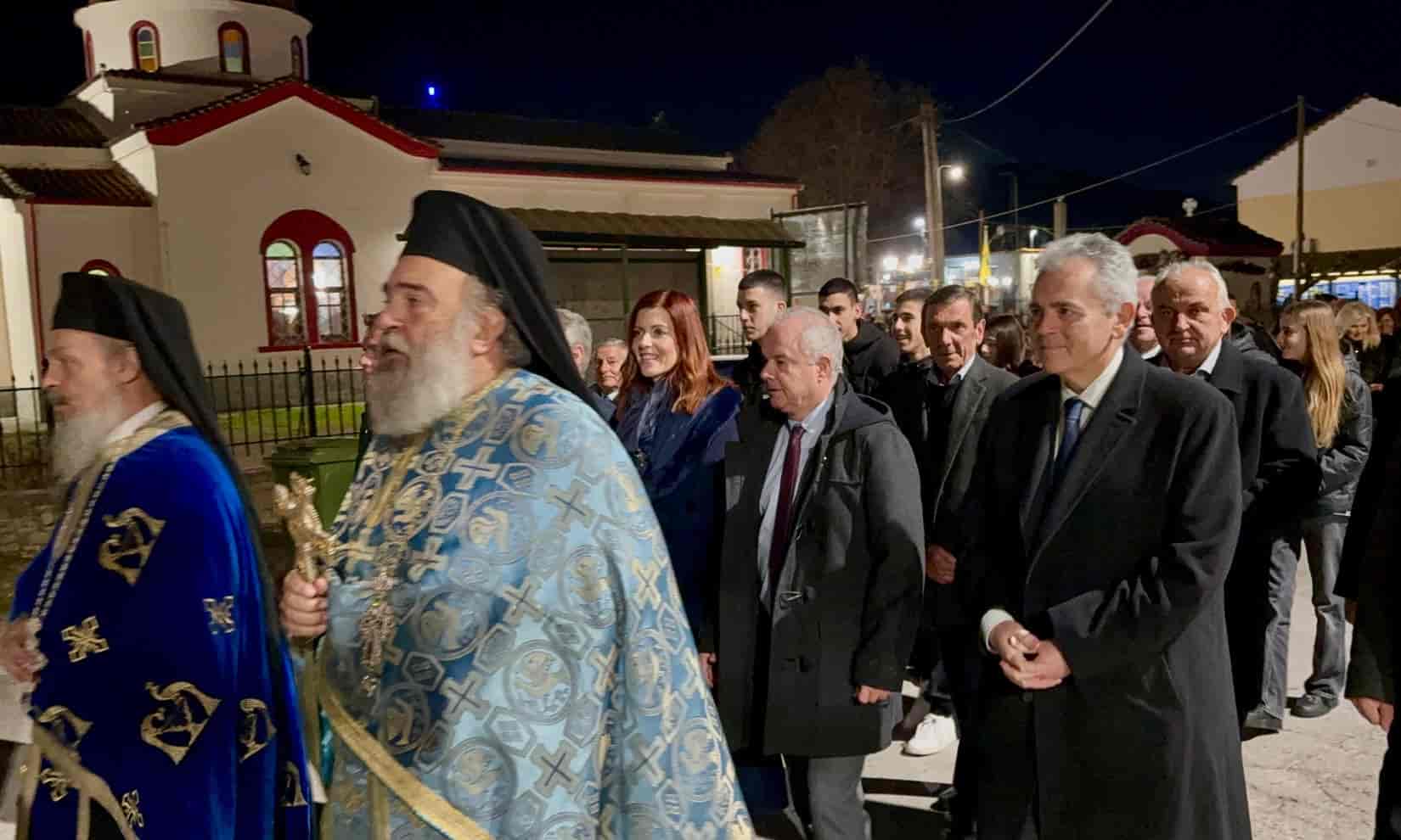 Ο Θεσσαλός πολιτικός συμμετείχε στον πανηγυρικό εσπερινό και την λιτανεία της εικόνας του Αγίου στους δρόμους της κοινότητας, ενώ ακολούθως είχε την ευκαιρία σε καφενείο του χωριού να ανταλλάξει ευχές, αλλά και να συζητήσει με αγρότες, οι οποίοι διαμαρτύρονται για τις καθυστερήσεις στις αποζημιώσεις στο φυτικό κεφάλαιο, από τις ζημιές που προκάλεσε ο Daniel. Επίσης, έγινε κοινωνός παραπόνων των αμυγδαλοπαραγωγών που νιώθουν αδικημένοι, σε σχέση με τους παραγωγούς αμυγδάλου της Μαγνησίας, καθώς έως σήμερα δεν έχουν λάβει καμία αποζημίωση.