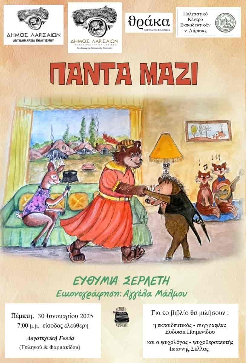 To βιβλίο της Ευθυμίας Σερλέτη «Πάντα μαζί» παρουσιάζεται στη Λάρισα την Πέμπτη, 30 Ιανουαρίου 2025, στις 7:00 μ.μ., στη Λογοτεχνική Γωνία (Γαληνού & Φαρμακίδου) από το Πολιτιστικό Κέντρο Εκπαιδευτικών N. Λάρισας, σε συνεργασία με την Αντιδημαρχία Πολιτισμού και την Αντιδημαρχία Κοινωνικής Πολιτικής & Πολιτικών Ισότητας του Δήμου Λαρισαίων και το περιοδικό «Θράκα».
