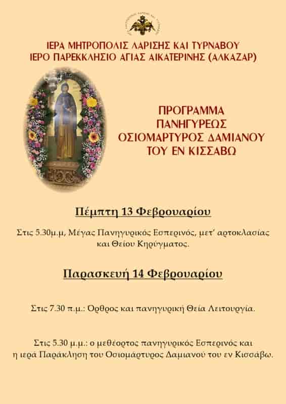 – Παρασκευή 14 Φεβρουαρίου στις 5.30 μ.μ., θα τελεστεί ο Μεθέορτος Πανηγυρικός Εσπερινός και η Ιερά Παράκληση του Οσιομάρτυρος Δαμιανού του εν Κισσάβω.
