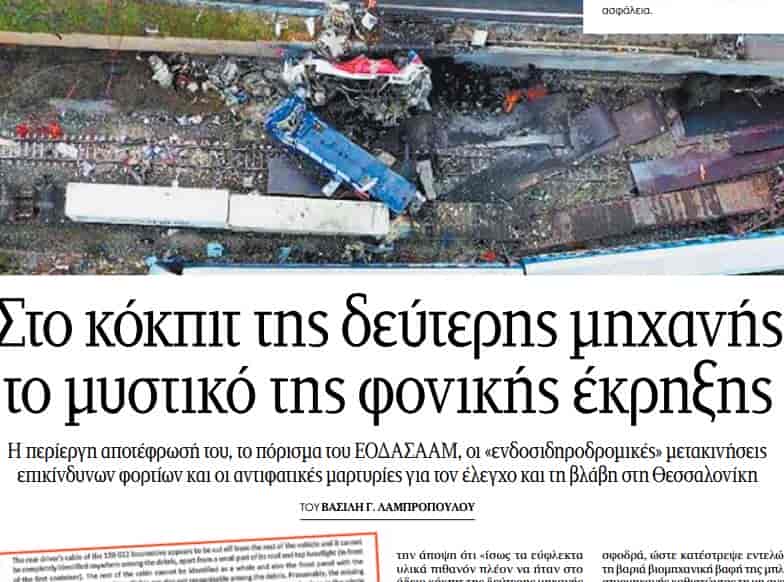 Σε εκτενές ρεπορτάζ του αστυνομικού συντάκτη Βασίλη Λαμπρόπουλου, αναλύονται τα όσα αναφέρονται στο πόρισμα του ΕΟΔΑΣΑΑΜ, η περίεργη αποτέφρωση του κοκπιτ της δεύτερης μηχανής του εμπορικού τρένου, οι ««ενδοσιδηροδρομικές» μετακινήσεις επικίνδυνων φορτίων, καθώς και οι αντιφατικές μαρτυρίες για τον έλεγχο και τη βλάβη στη Θεσσαλονίκη, που είχε ως αποτέλεσμα να αναχωρήσει με καθυστέρηση η εμπορική αμαξοστοιχία, όπως έχει ο ίδιος αποκαλύψει.