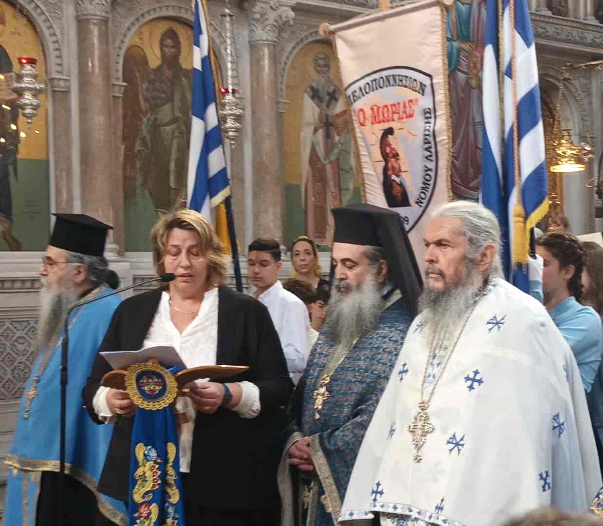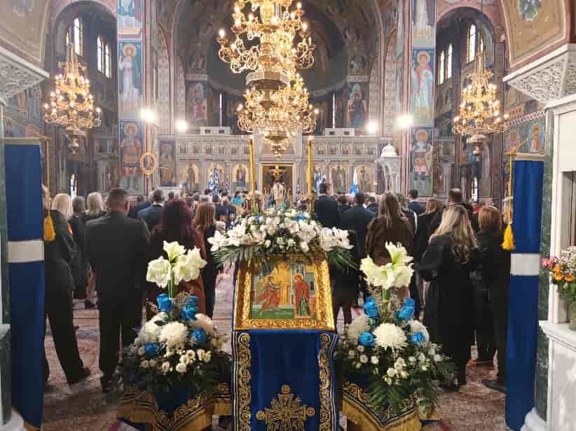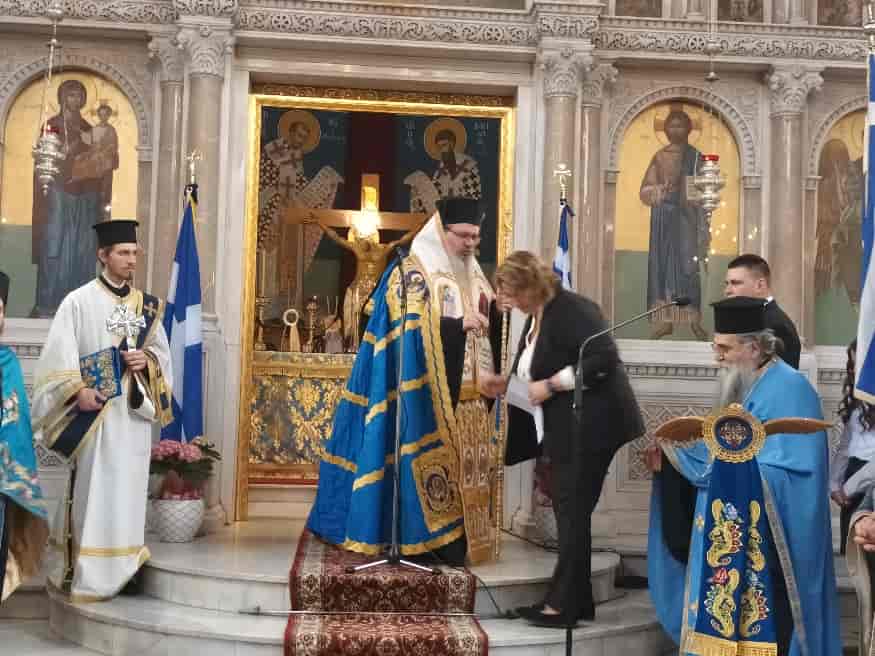 Μετά το τέλος της δοξολογίας και εντός του Ιερού Ναού εκφωνήθηκε ο πανηγυρικός της ημέρας από την κα. Ευθαλία Κολοκοτρώνη, Εκπαιδευτικός ΠΕ 02, Υποδιευθύντρια 1ου Πειραματικού Γυμνασίου Λάρισας.