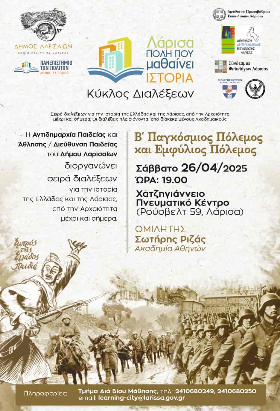 Η 8η διάλεξη, με θέμα “Β΄ Παγκόσμιος Πόλεμος & Εμφύλιος Πόλεμος” θα πραγματοποιηθεί το Σάββατο 26 Απριλίου 2025, ώρα 19:00 στο Χατζηγιάννειο Πνευματικό Κέντρο, με εισηγητή τον κ. Σωτήρη Ριζά.
