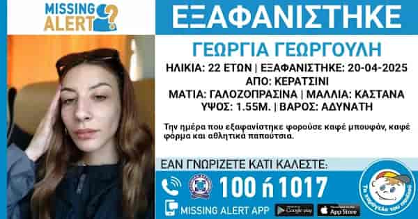 Στις 20/4/2025, εξαφανίστηκε από την περιοχή του Κερατσινίου, η Γεωργία Γεωργούλη, 22 ετών από το Αμούρι Ελασσόνας.