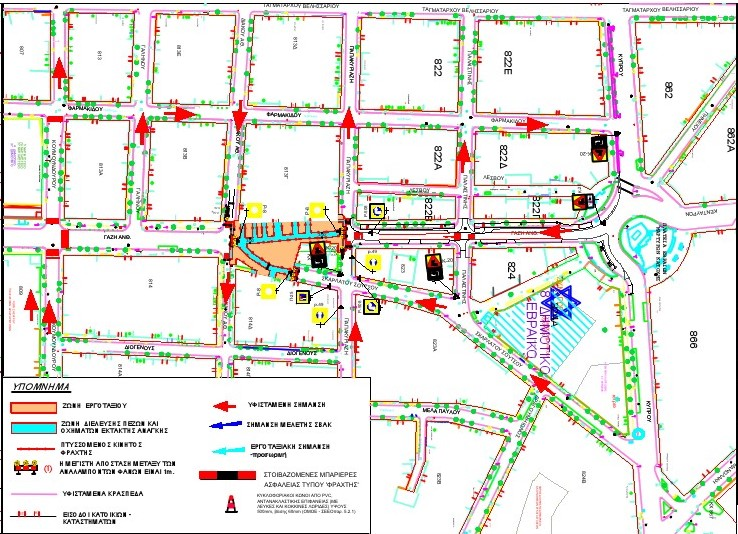 Κατά τη διάρκεια των εργασιών, η κυκλοφορία των οχημάτων στην οδό Ανθίμου Γαζή και στις κάθετες οδούς θα διεξάγεται σύμφωνα με τις προβλεπόμενες πληροφοριακές και ρυθμιστικές πινακίδες που θα τοποθετηθούν από τον ανάδοχο του έργου. Οι ρυθμίσεις που θα ισχύσουν στην ευρύτερη περιοχή εμφανίζονται στο διάγραμμα που ακολουθεί: