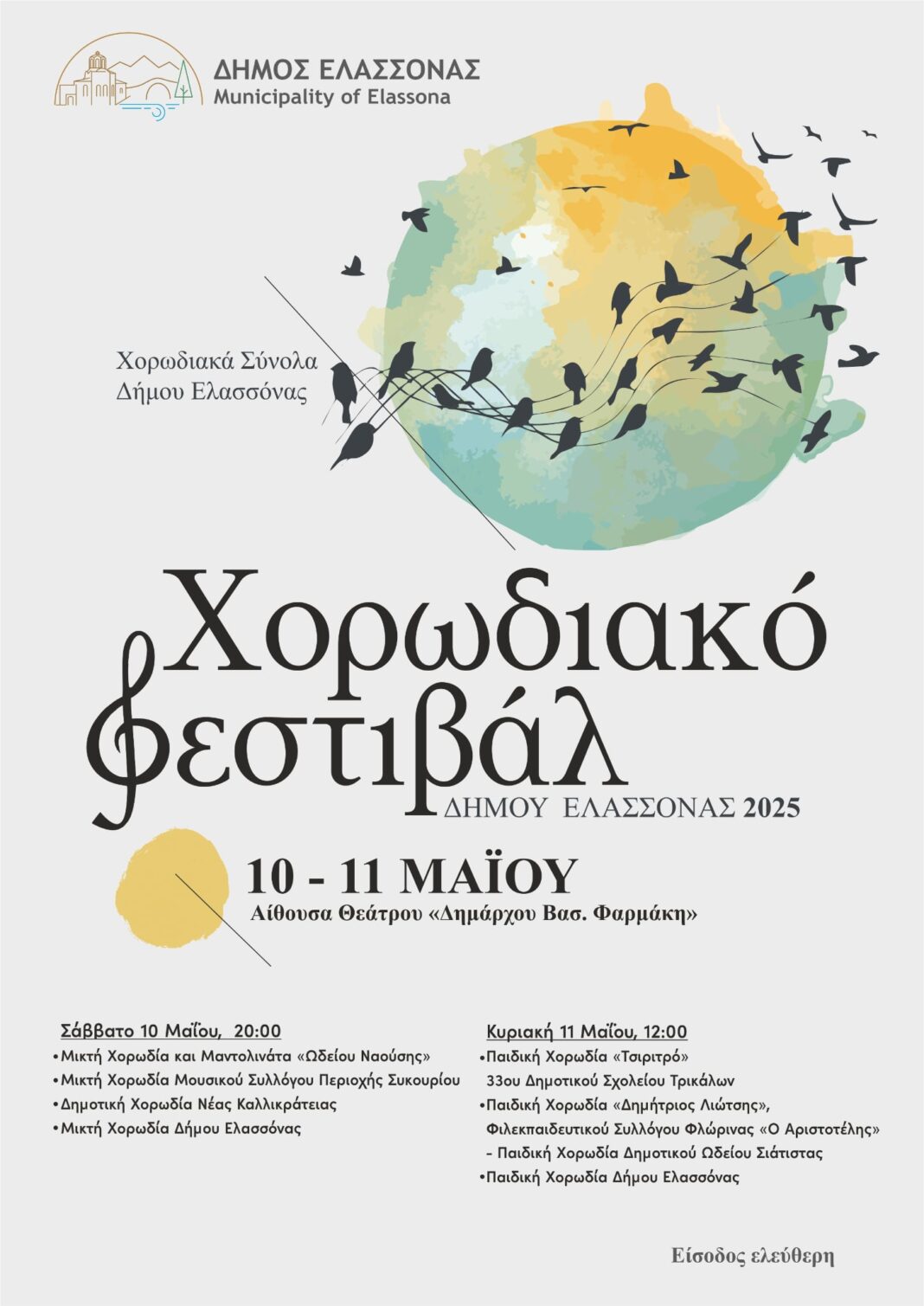Τα Χορωδιακά Σύνολα Δήμου Ελασσόνας (Μικτή και Παιδική Χορωδία) διευθύνει η μαέστρος Ευλαμπία Ντούλα και στο πιάνο συνοδεύει ο Παναγιώτης Μπαλανίκας.