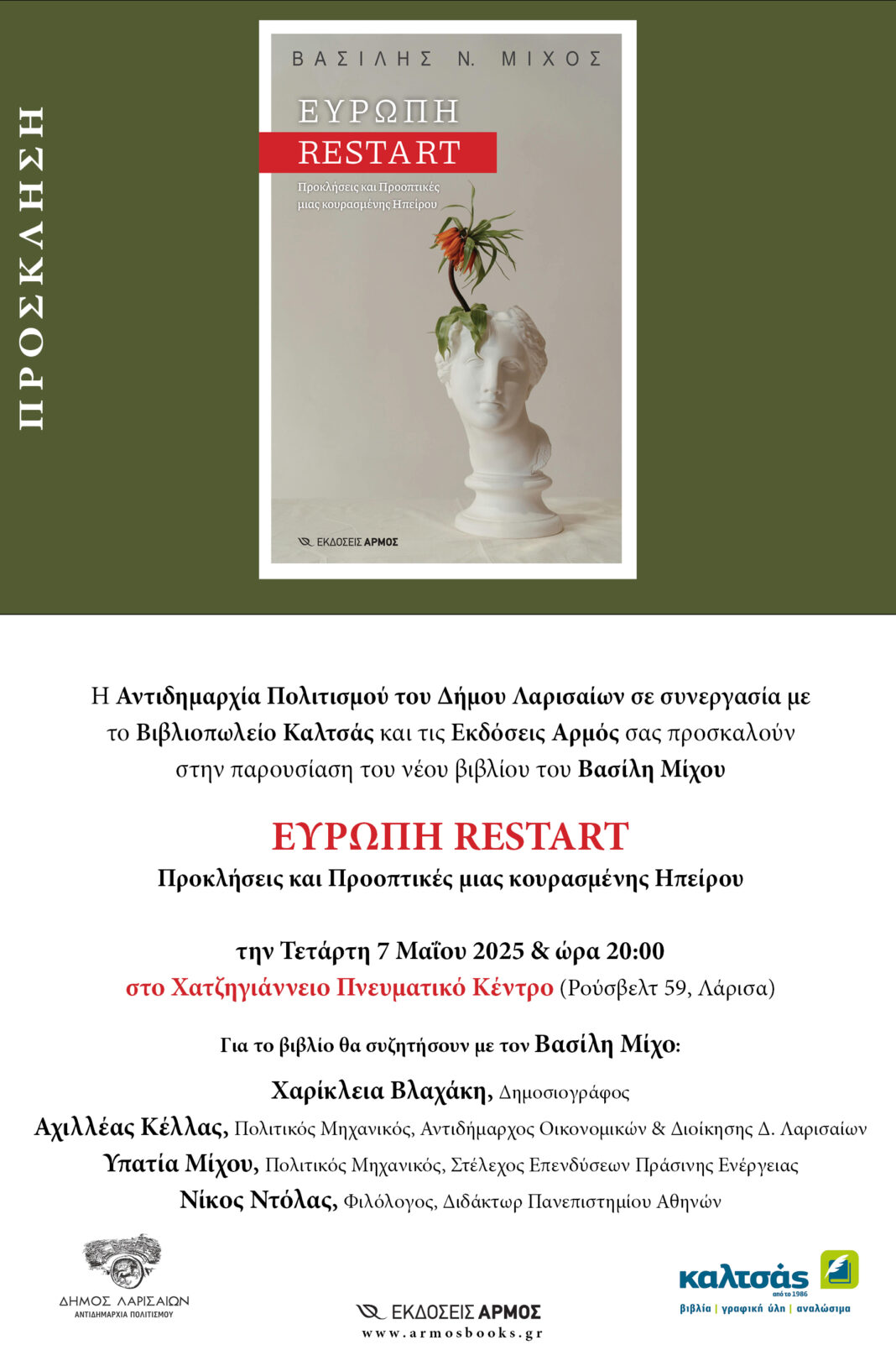 Η Αντιδημαρχία Πολιτισμού του Δήμου Λαρισαίων σε συνεργασία με το Βιβλιοπωλείο Καλτσάς και τις Εκδόσεις Αρμός, παρουσιάζουν το νέο βιβλίο του Βασίλη Μίχου με τίτλο “ΕΥΡΩΠΗ RESTART – Προκλήσεις και Προοπτικές μιας κουρασμένης Ηπείρου” την Τετάρτη 7 Μαΐου 2025, στις 20:00, στο Χατζηγιάννειο Πνευματικό Κέντρο Λάρισας (Ρούσβελτ 59, Λάρισα).