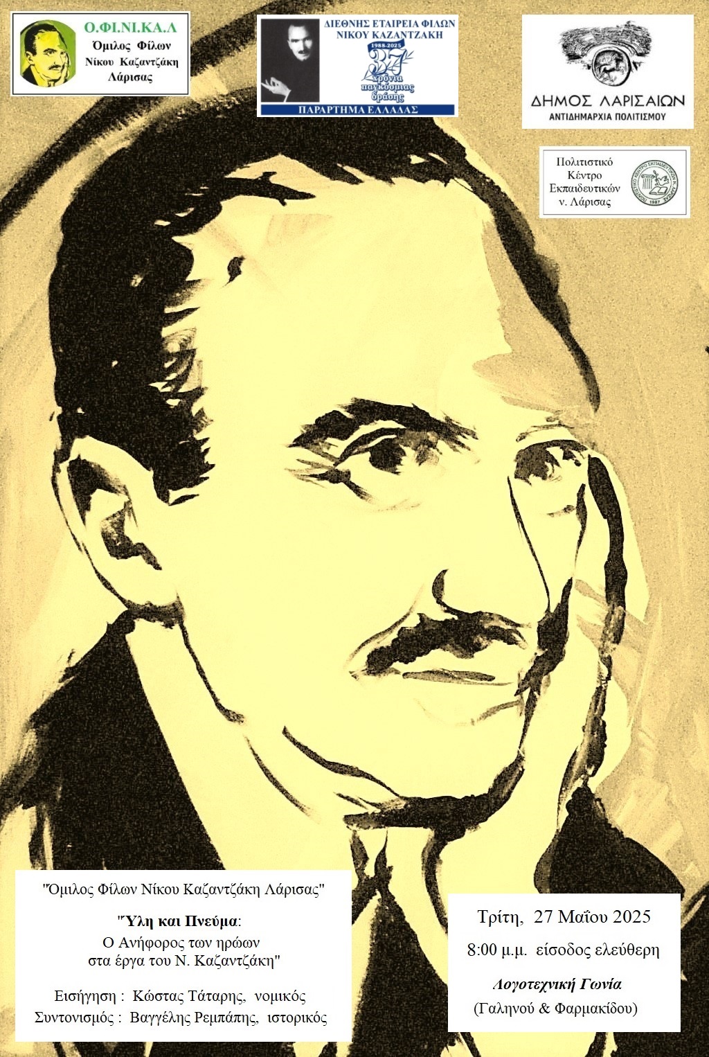 Ο Όμιλος Φίλων Νίκου Καζαντζάκη Λάρισας – ΟΦΙΝΙΚΑΛ, η Διεθνής Εταιρεία Φίλων Ν. Καζαντζάκη και το Πολιτιστικό Κέντρο Εκπαιδευτικών Νομού Λάρισας – ΠΟΚΕΛ, σε συνεργασία με την Αντιδημαρχία Πολιτισμού του Δήμου Λαρισαίων, διοργανώνουν την εκδήλωση «Ύλη και Πνεύμα: Ο Ανήφορος των ηρώων, στα έργα του Νίκου Καζαντζάκη», την Τρίτη, 27 Μαΐου 2025 στη Λογοτεχνική Γωνία (Φαρμακίδου & Γαληνού), στις 8:00 μ.μ. με ελεύθερη είσοδο.