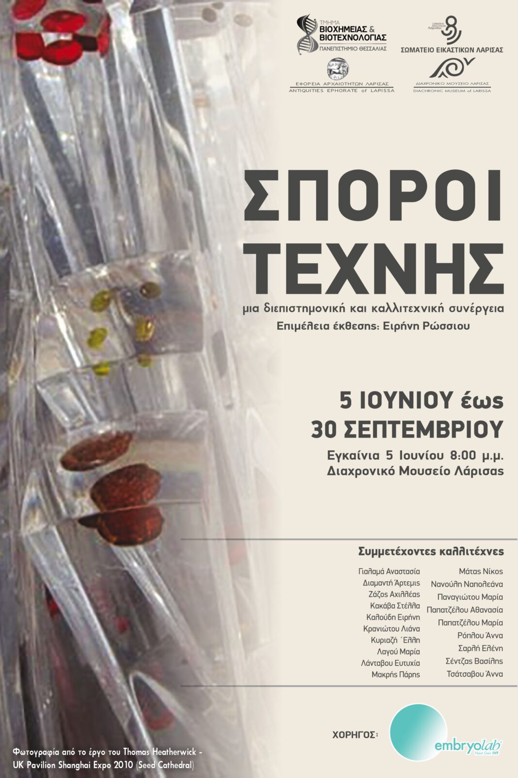 Στο πλαίσιο των εορταστικών εκδηλώσεων για τα 25 χρόνια από την ίδρυση και λειτουργία του Τμήματος Βιοχημείας και Βιοτεχνολογίας του Πανεπιστημίου Θεσσαλίας, το Διαχρονικό Μουσείο Λάρισας φιλοξενεί στην αίθουσα περιοδικών εκθέσεων την ομαδική εικαστική έκθεση του Σωματείου Εικαστικών Καλλιτεχνών Λάρισας «8» με τίτλο «Σπόροι Τέχνης», σε επιμέλεια της Αρχαιολόγου-Ιστορικού Τέχνης Ειρήνης Ρώσσιου.