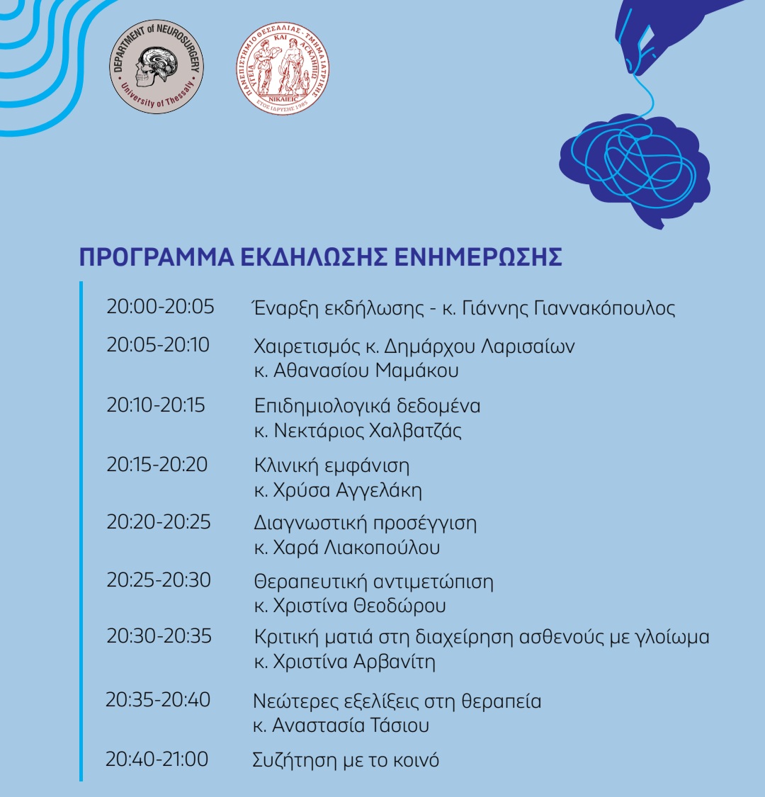 Στο πλαίσιο αυτό, η Νευροχειρουργική Κλινική του Πανεπιστημίου Θεσσαλίας διοργανώνει ενημερωτική εκδήλωση την Παρασκευή 30 Μαΐου 2025 στις 8.00 μ.μ. στο Χατζηγιάννειο Πνευματικό κέντρο της Λάρισας.