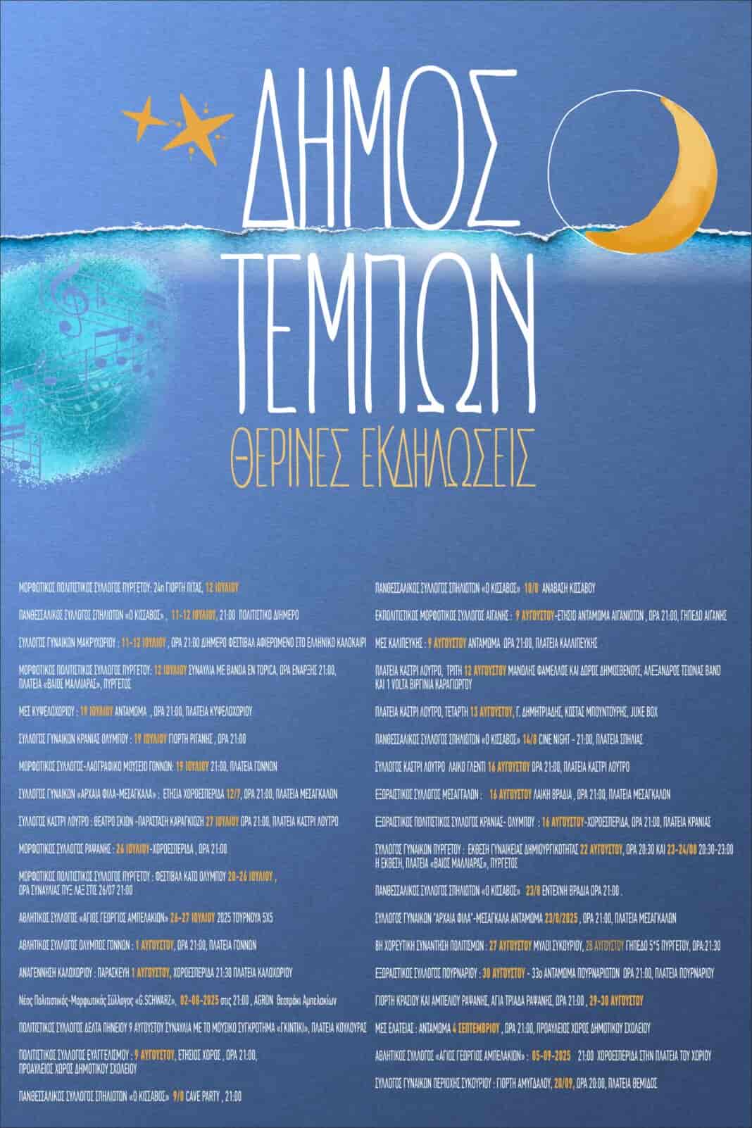 Ο Δήμος Τεμπών σας προσκαλεί και φέτος να ζήσουμε μαζί ένα αξέχαστο καλοκαίρι, γεμάτο μουσική, παραδοσιακές γιορτές και πολιτιστικές δράσεις για όλες τις ηλικίες.