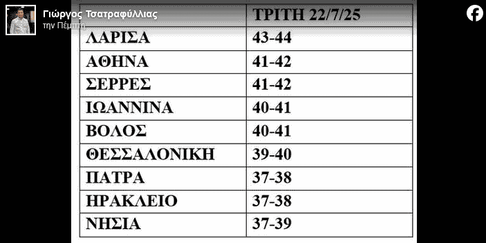 Μάλιστα στη Λάρισα αναμένεται η θερμοκρασία να φτάσει και τους 44 βαθμούς Κελσίου, ενώ η Αθήνα θα βρεθεί στη… δεύτερη θέση με 42!