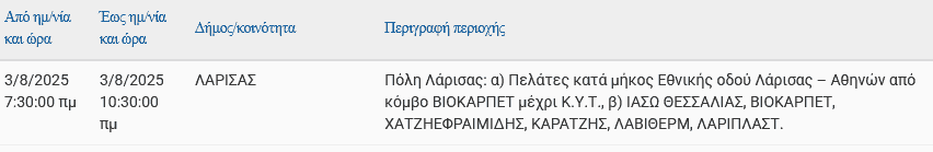 Σε προγραμματισμένες διακοπές ρεύματος προχωρά ο ΔΕΔΔΗΕ Α.Ε., σήμερα Κυριακή 3 Αυγούστου, σε περιοχές της πόλης και του νομού Λάρισας για να εκτελεσθούν απαραίτητες τεχνικές εργασίες στο δίκτυο.