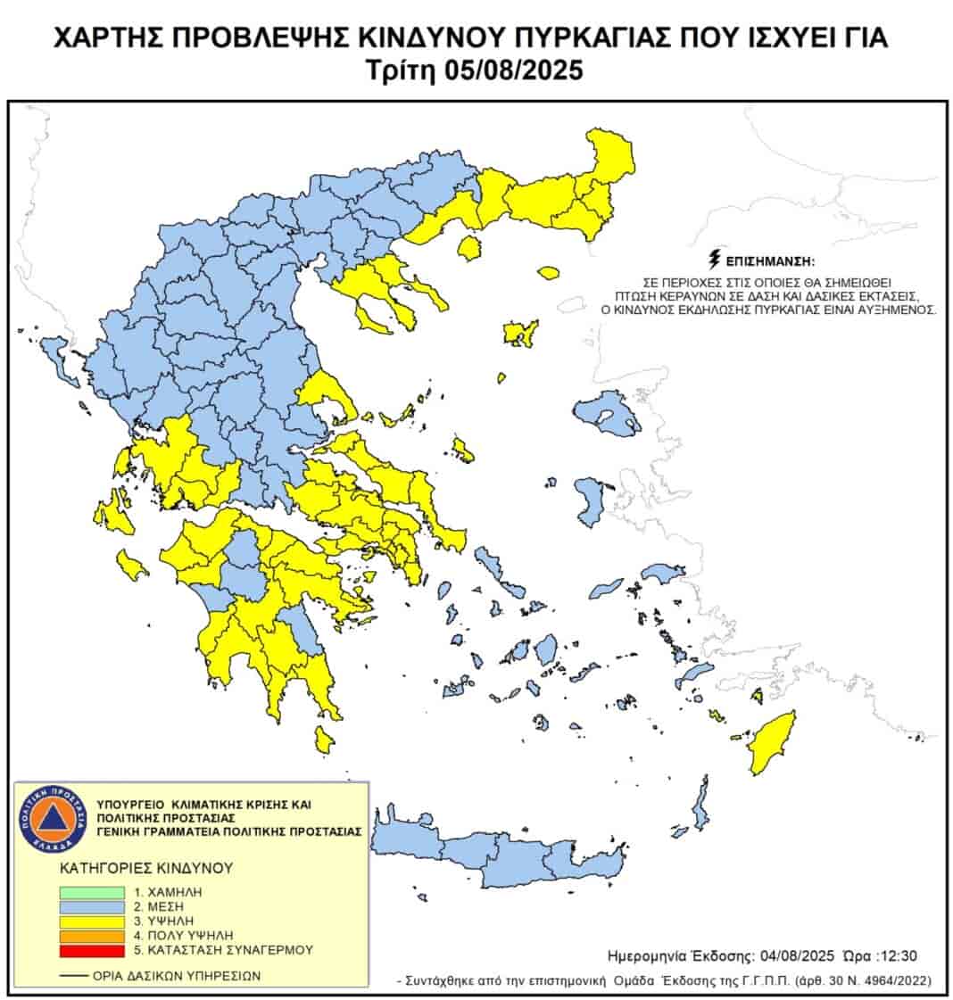 Ετοιμότητα λόγω του Χάρτη πρόβλεψης κινδύνου πυρκαγιάς (κατηγορία 3) που ισχύει για την Τρίτη 05 Αυγούστου 2025