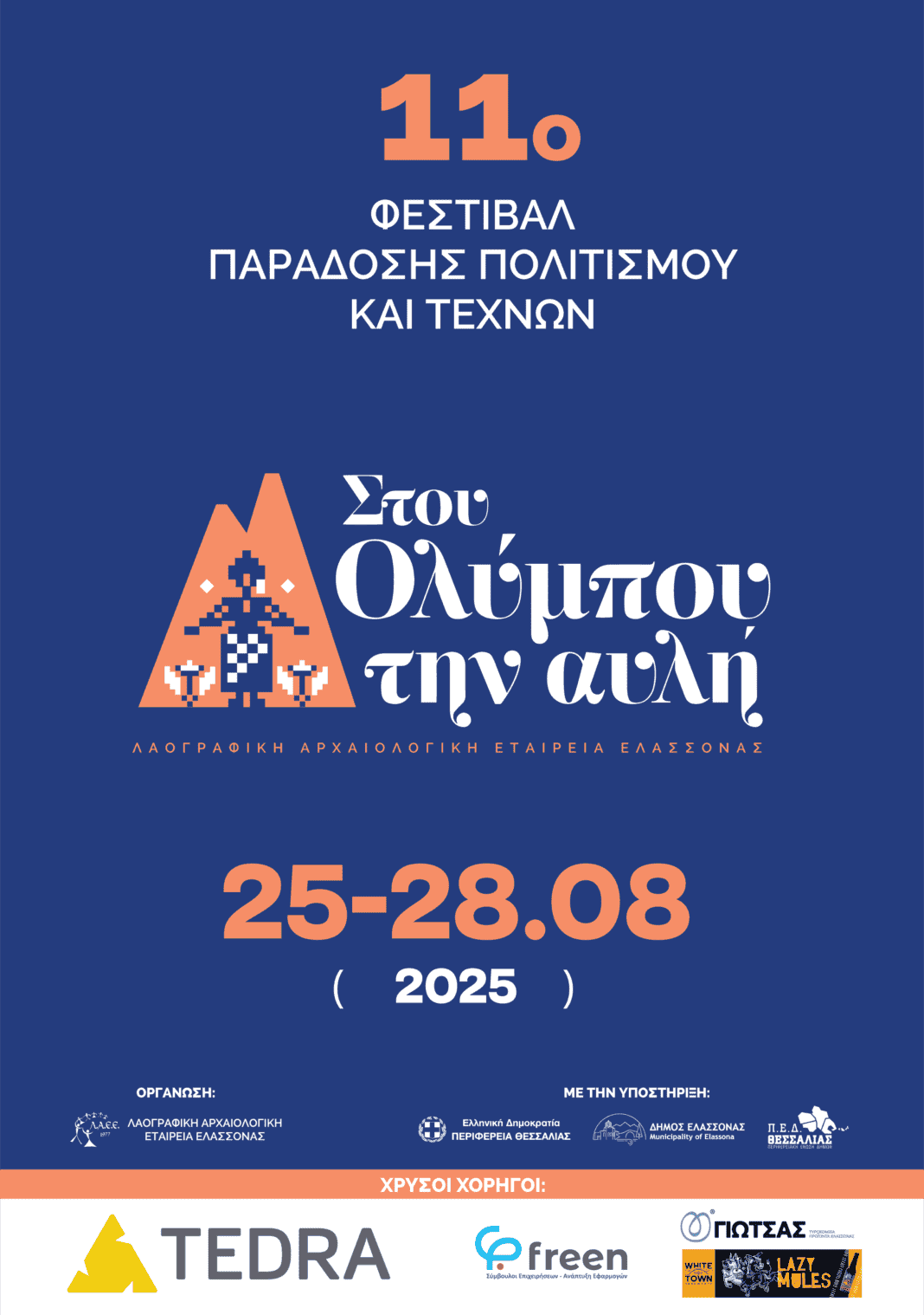 Η ΛΑΟΓΡΑΦΙΚΗ ΑΡΧΑΙΟΛΟΓΙΚΗ ΕΤΑΙΡΙΑ ΕΛΑΣΣΟΝΑΣ εδώ και 48 χρόνια κατάφερε να αλλάξει το πολιτιστικό τοπίο της περιοχής μας. Ο θεσμός του Φεστιβάλ γίνεται φάρος και ελπίδα, σηματοδοτώντας και προβάλλοντας ένα αισιόδοξο μήνυμα, ότι αν θέλουμε μπορεί να γίνει το τόπος μας, ο Όλυμπος, ένα παγκόσμιο σημείο Πολιτισμού. Αυτή μας η προσπάθεια χρωματίζεται από την πανδαισία των χρωμάτων και αμφιέσεων, από τα χαμόγελα και τη ζωντάνια των συμμετεχόντων χορευτικών σχημάτων και οι ήχοι της μουσικής μας γεμίζουν με αισιοδοξία για το μεγάλο όραμα της παράδοσης και του πολιτισμού.