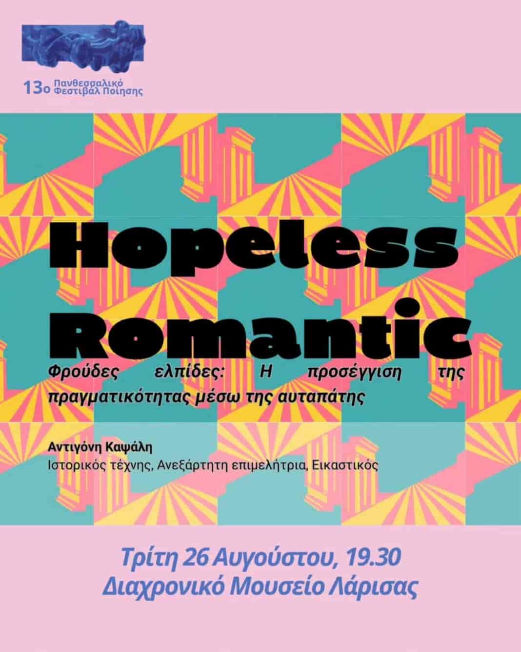 Λίγο νωρίτερα, στις 19:30, εγκαινιάζεται στο Διαχρονικό Μουσείο η περιοδική έκθεση σύγχρονης τέχνης «Hopeless Romantic / Φρούδες ελπίδες: Η προσέγγιση της πραγματικότητας μέσω της αυταπάτης». Η έκθεση, σε επιμέλεια της ιστορικού τέχνης και εικαστικού Αντιγόνης Καψάλη, εξερευνά την επιμονή της ελπίδας ως στάσης ζωής σε περιόδους συλλογικής κρίσης και αβεβαιότητας, μέσα από έργα που κινούνται ανάμεσα στο φαντασιακό και το ειρωνικό.