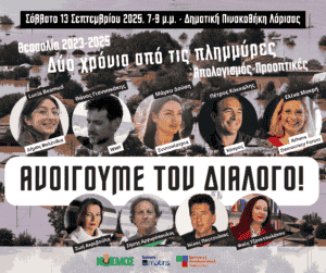 Δύο χρόνια μετά τις καταστροφικές πλημμύρες Daniel και Elias, o Κόσμος-Πράσινη Συμφωνία και η Κοινωνική Αυτοδιοικητική Παρέμβαση διοργανώνουμε εκδήλωσή μας, στη Δημοτική Πινακοθήκη Λάρισας το Σάββατο 13 Σεπτεμβρίου 2025 στις 7μ.μ.
