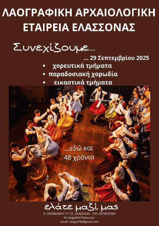 Η Λαογραφική Αρχαιολογική Εταιρεία Ελασσόνας, συνεχίζει εδώ και 48 χρόνια την προσφορά της στον πολιτισμό, την προσφορά της στην παραδοσιακή μουσική και τους χορούς, στις τέχνες και στην δια βίου μάθηση.