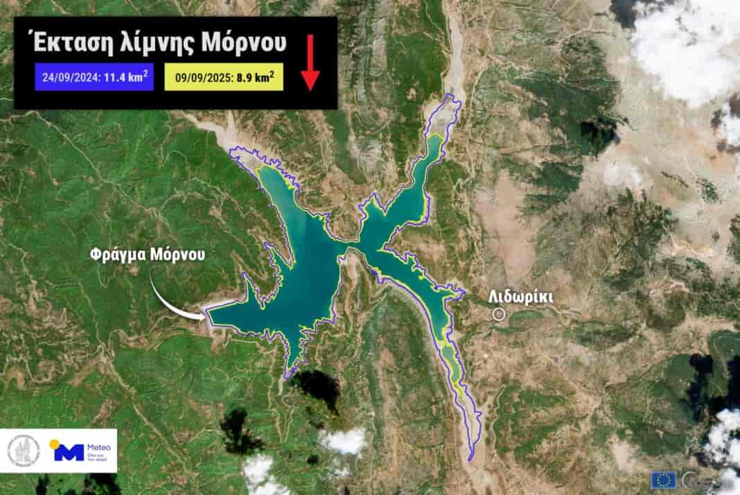 Όσον αφορά στα αποθέματα του ταμιευτήρα της λίμνης του Μόρνου, η μείωση σε αυτά συμπίπτει με τη συρρίκνωση της επιφάνειας: -42%. Τον Σεπτέμβριο του 2024 , σύμφωνα με τα στοιχεία της ΕΥΔΑΠ, η λίμνη είχε 328 εκατομμύρια κυβικά νερού. Τον Σεπτέμβριο του 2025, 193 εκατομμύρια κυβικά νερού.