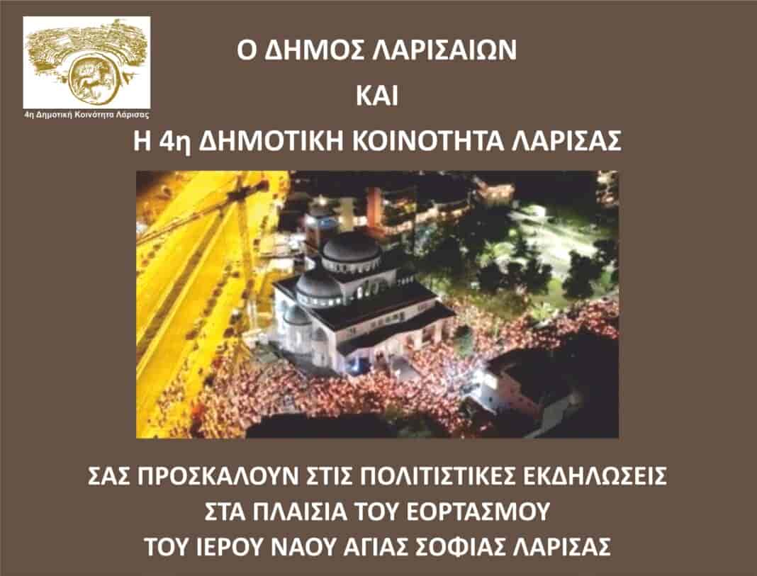 Πολιτιστικές Εκδηλώσεις για τον εορτασμό του Ιερού Ναού της Αγίας Σοφίας Λάρισας, διοργανώνει σήμερα στην πλατεία Ζιαζιά στη συνοικία της Χαραυγής, ο Δήμος Λαρισαίων και η 4η Δημοτική Κοινότητα Λάρισας.