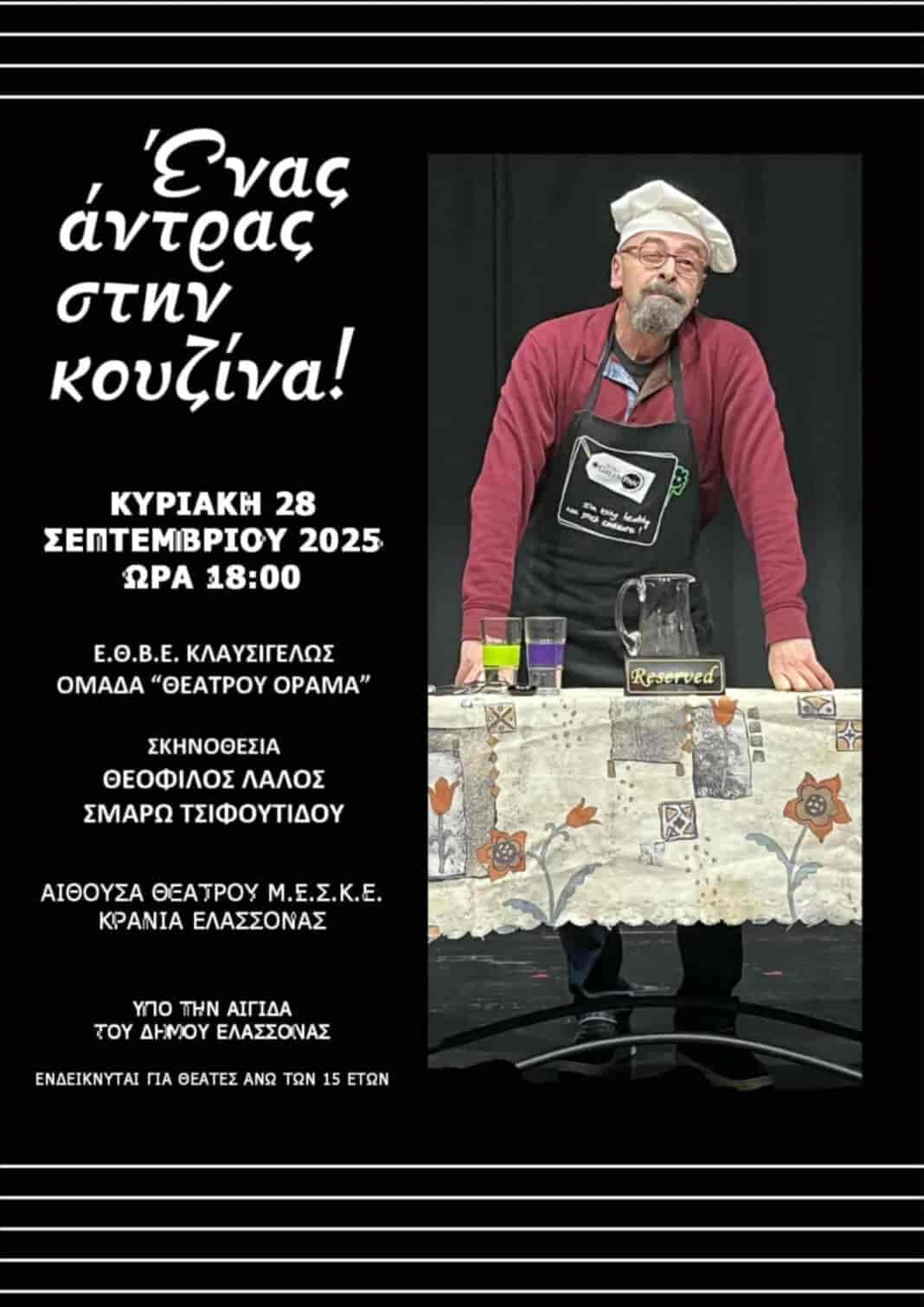 Ο Δήμος Ελασσόνας φιλοξενεί την Κυριακή 28 Σεπτεμβρίου 2025 και ώρα 18:00, στην Αίθουσα Θεάτρου Μ.Ε.Σ.Κ.Ε. στην Κρανιά Ελασσόνας, τον θεατρικό μονόλογο της Λίζας Κωνσταντοπούλου με τίτλο «Ένας άντρας στην κουζίνα!», σε σκηνοθεσία των Θεόφιλου Λάλου και Σμαρώς Τσιφουτίδου.