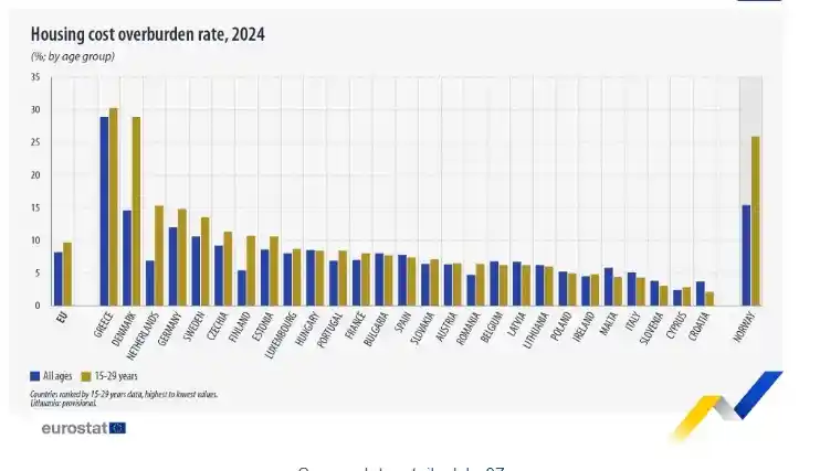 Επιπλέον, σε αρκετές χώρες όπου οι νέοι φεύγουν από το γονικό σπίτι νωρίτερα —όπως η Δανία, η Ολλανδία, η Γερμανία, η Σουηδία και η Φινλανδία— το κόστος στέγασης αποδεικνύεται δυσανάλογα υψηλό για τις νεότερες ηλικιακές ομάδες. Αντίθετα, σε κράτη όπου οι νέοι αργούν να ανεξαρτητοποιηθούν —όπως η Κύπρος, η Κροατία και η Ιταλία— το ποσοστό επιβάρυνσης είναι χαμηλότερο.