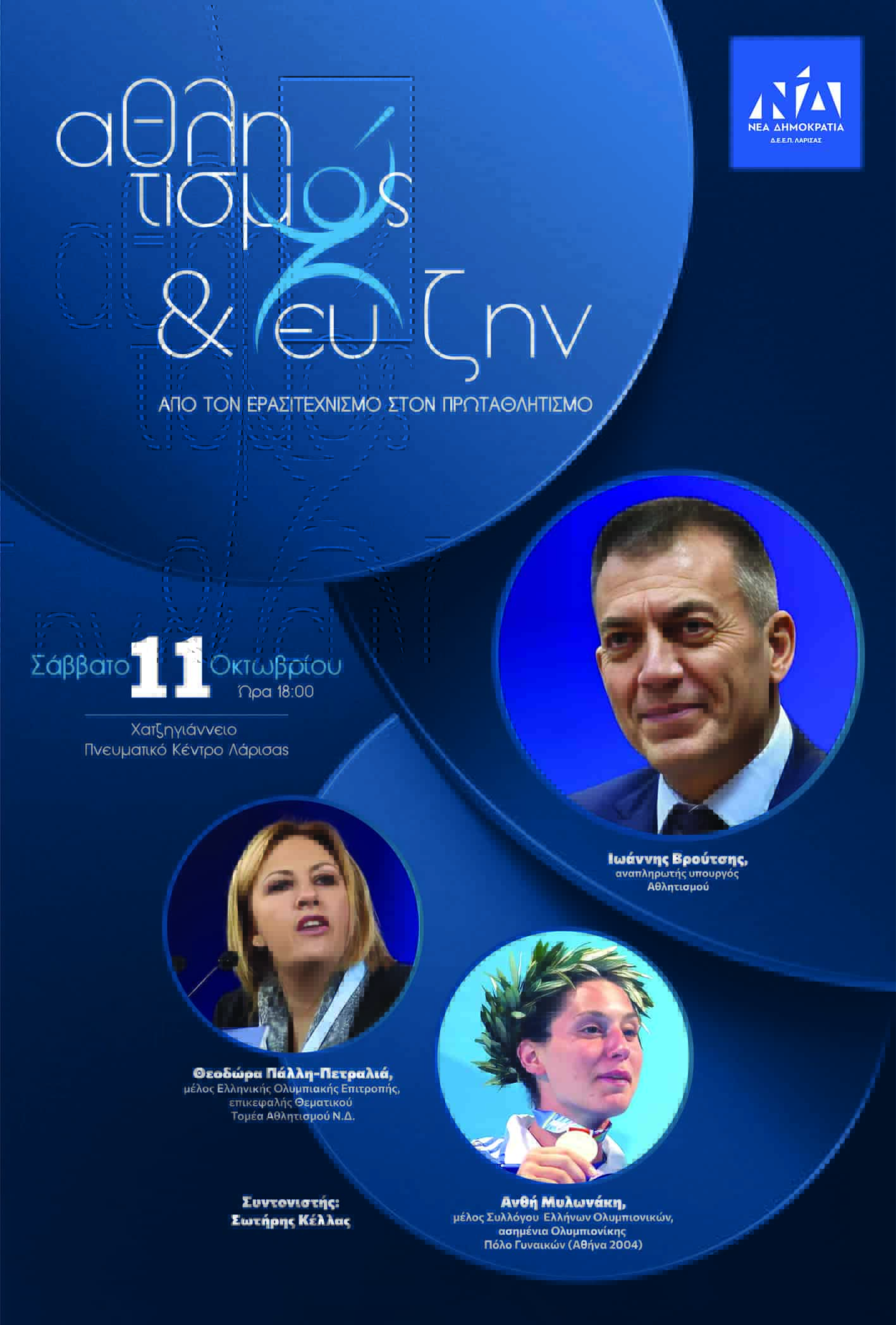 Η εκδήλωση έχει ως τίτλο «Αθλητισμός και Ευ ζην: Από τον ερασιτεχνισμό στον πρωταθλητισμό.» και θα πραγματοποιηθεί στο «Χατζηγιάννειο» Πνευματικό Κέντρο Λάρισας το Σάββατο 11 Οκτωβρίου 2025 στις 18:00.