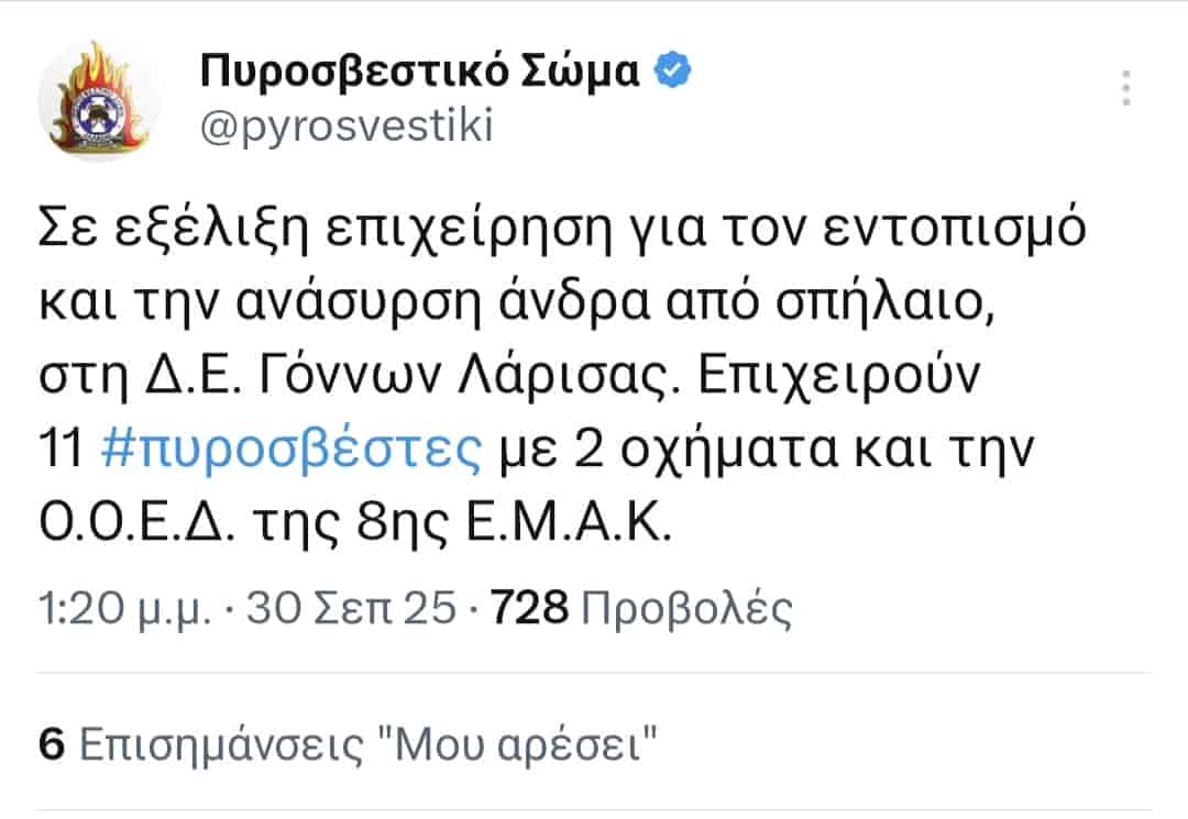 Ένα σοβαρό περιστατικό βρίσκεται σε εξέλιξη στον δρόμο από Γόννους προς Καλλιπεύκη, στο Δήμο Τεμπών, όταν ένας άνδρας εγκλωβίστηκε σε σπηλιά βάθους 22 μέτρων.