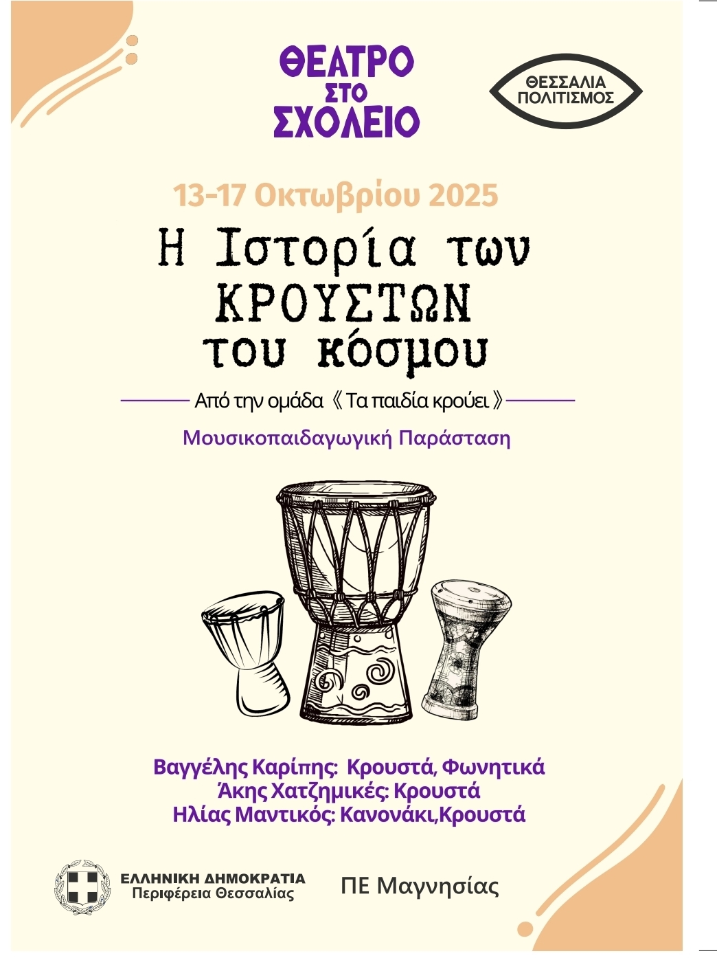 Η Περιφέρεια Θεσσαλίας υποστηρίζει με θέρμη τις πολιτιστικές δράσεις για παιδιά και σχεδιάζει με συνέπεια εξαιρετικής ποιότητας εκδηλώσεις. Στο πλαίσιο αυτό, η ομάδα «Τα Παιδία Κρούει», που αποτελείται από διεθνούς εμβέλειας μουσικούς, παρουσιάζει την Ιστορία των Κρουστών του Κόσμου για σχολεία στην Π.Ε. Μαγνησίας.