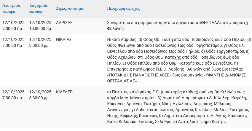 Σε προγραμματισμένες διακοπές ρεύματος προχωρά ο ΔΕΔΔΗΕ Α.Ε., σήμερα Κυριακή 12 Οκτωβρίου, σε περιοχές του νομού Λάρισας για να εκτελεσθούν απαραίτητες τεχνικές εργασίες στο δίκτυο.