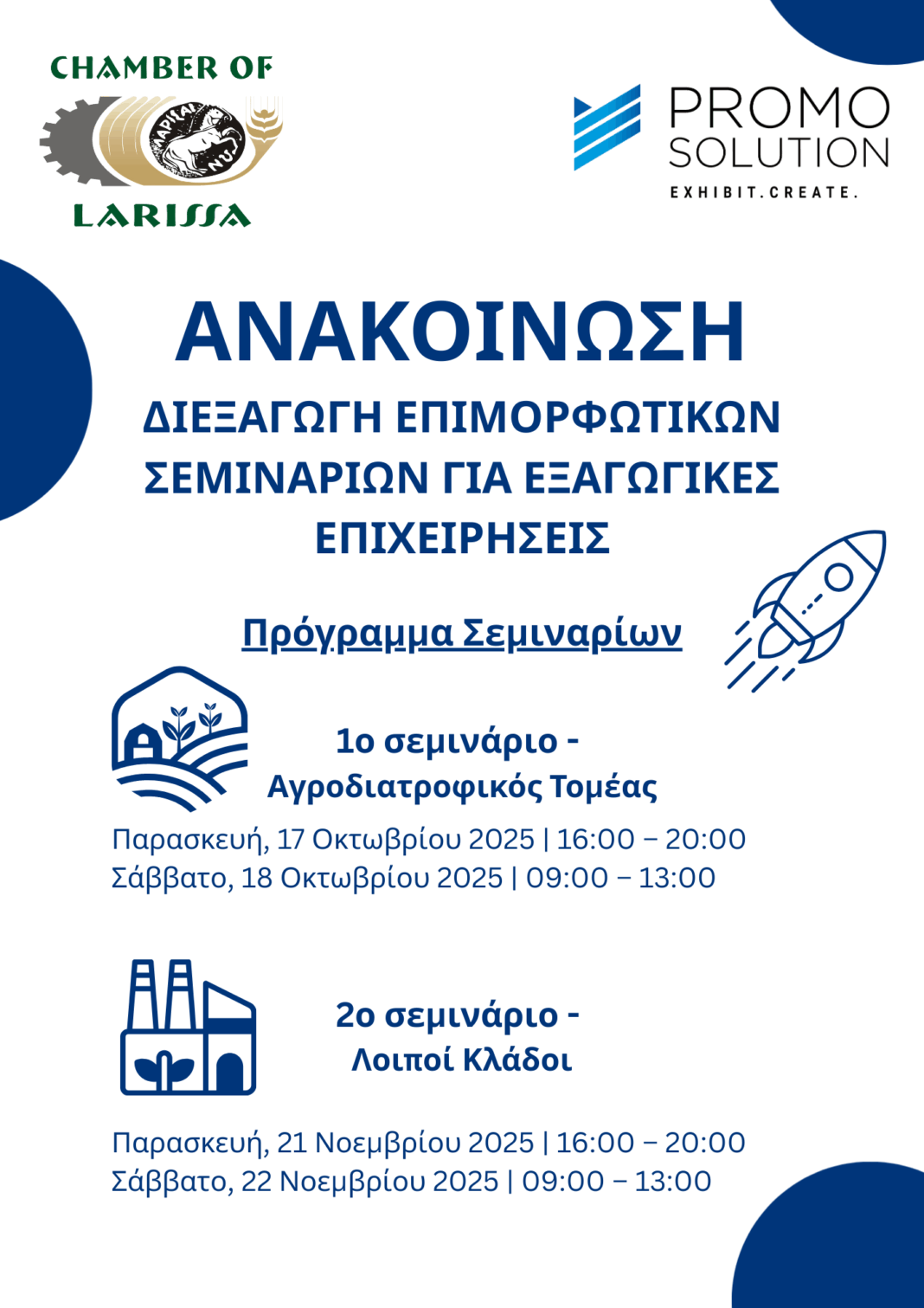Η συμμετοχή είναι δωρεάν (αρκεί το μέλος μας να είναι ταμειακά ενήμερο στο Μητρώο του Επιμελητηρίου για το έτος 2025) και απευθύνεται σε εξαγωγικές και εν δυνάμει επιχειρήσεις της Π.Ε. Λάρισας.