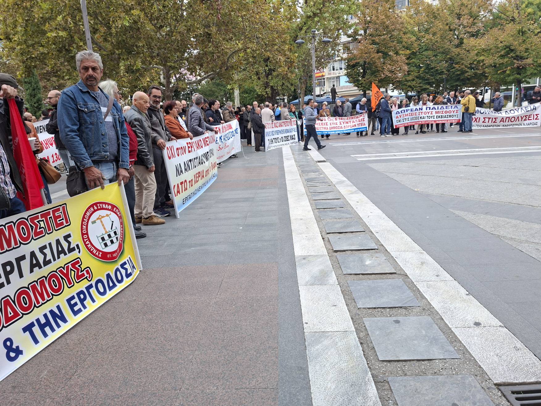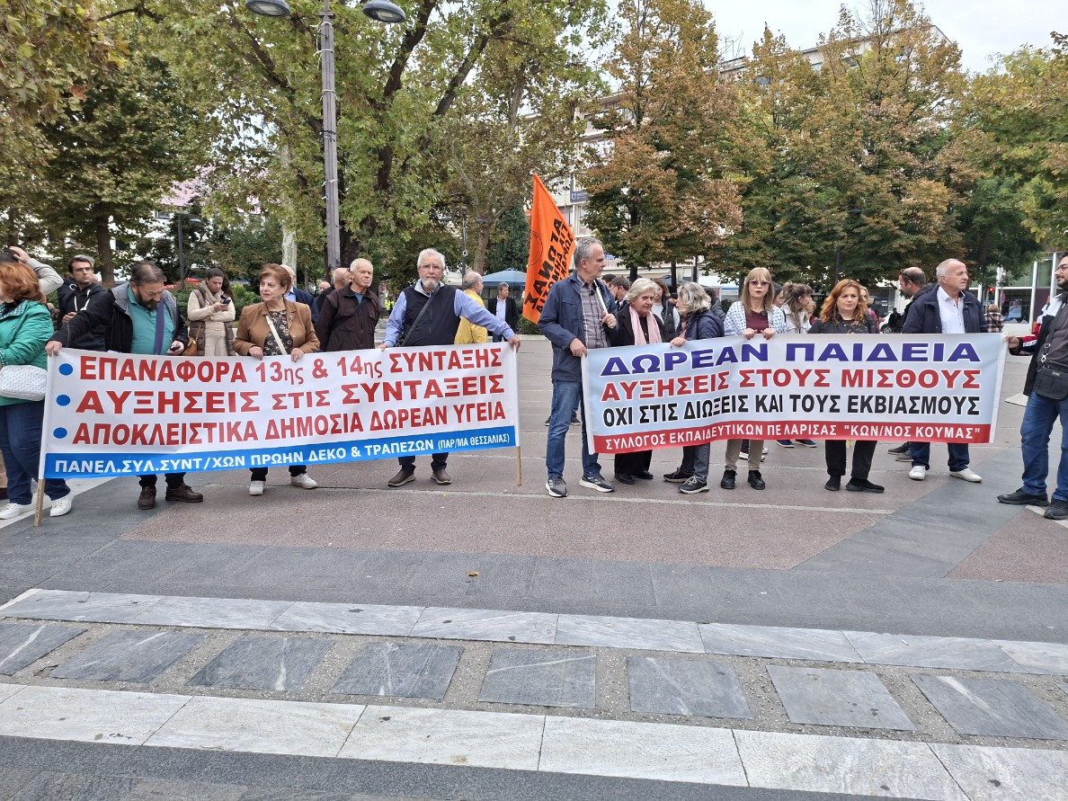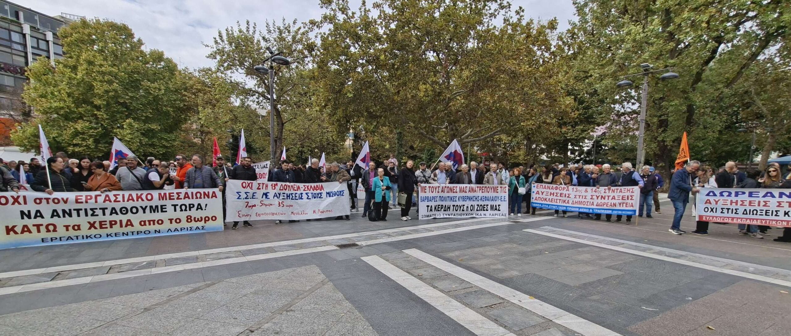 Η Συγκέντρωση διαμαρτυρίας πραγματοποιήθηκε στην Κεντρική πλατεία με την συμμετοχή του Εργατικού Κέντρου Λάρισας, σωματείων και άλλων φορέων, όπως ο Σύλλογος Εκπαιδευτικών Πρωτοβάθμιας Εκπαίδευσης Ν. Λάρισας «Κωνσταντίνος Κούμας», το Σωματείο Συνταξιούχων ΙΚΑ Ν. Λάρισας, το Συνδικάτο Κλωστοϋφαντουργίας Ιματισμού και Δέρματος Ν. Λάρισας.