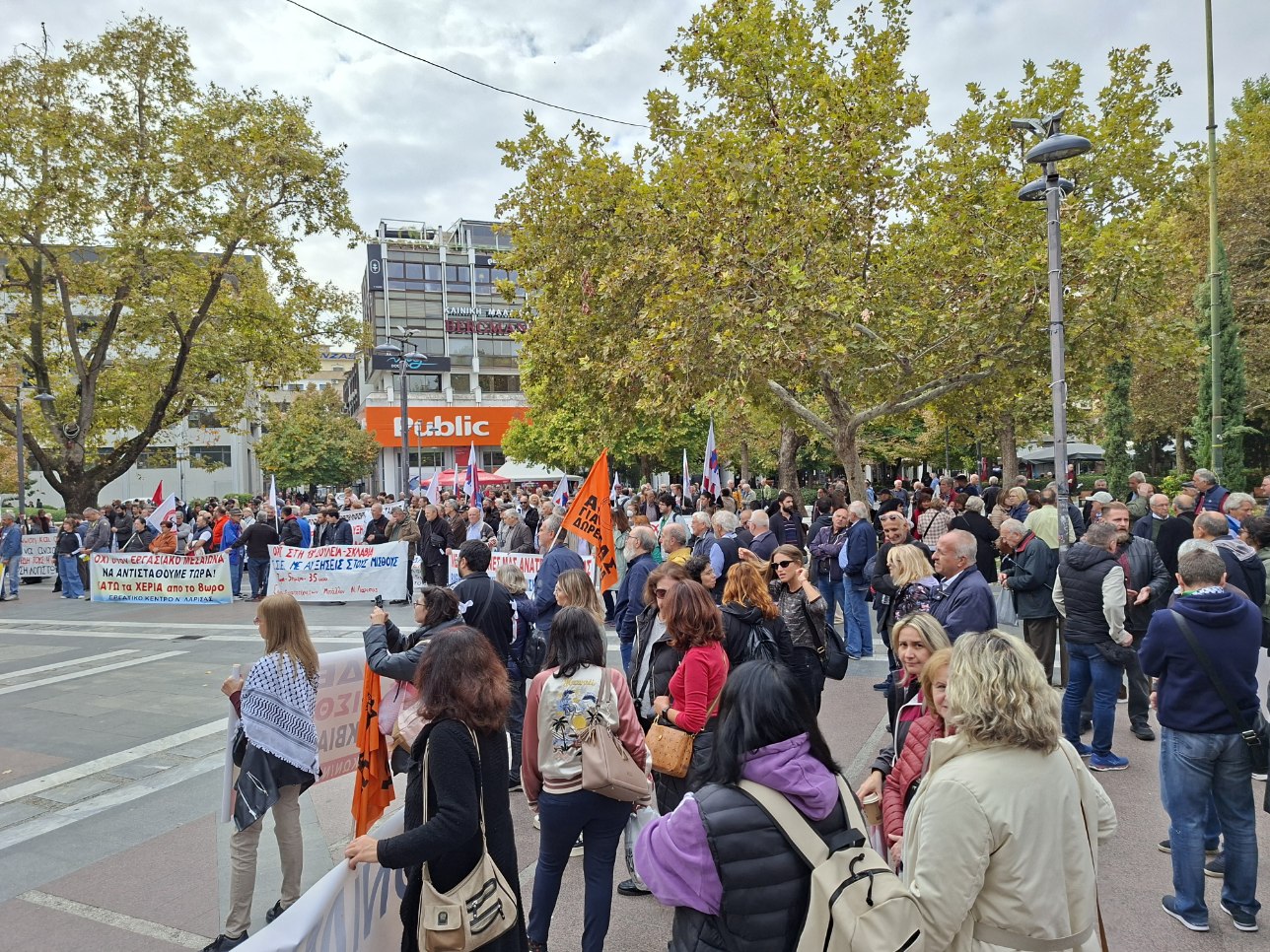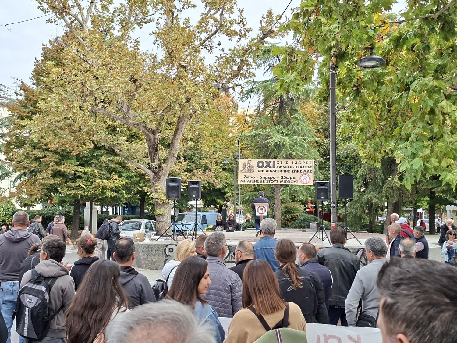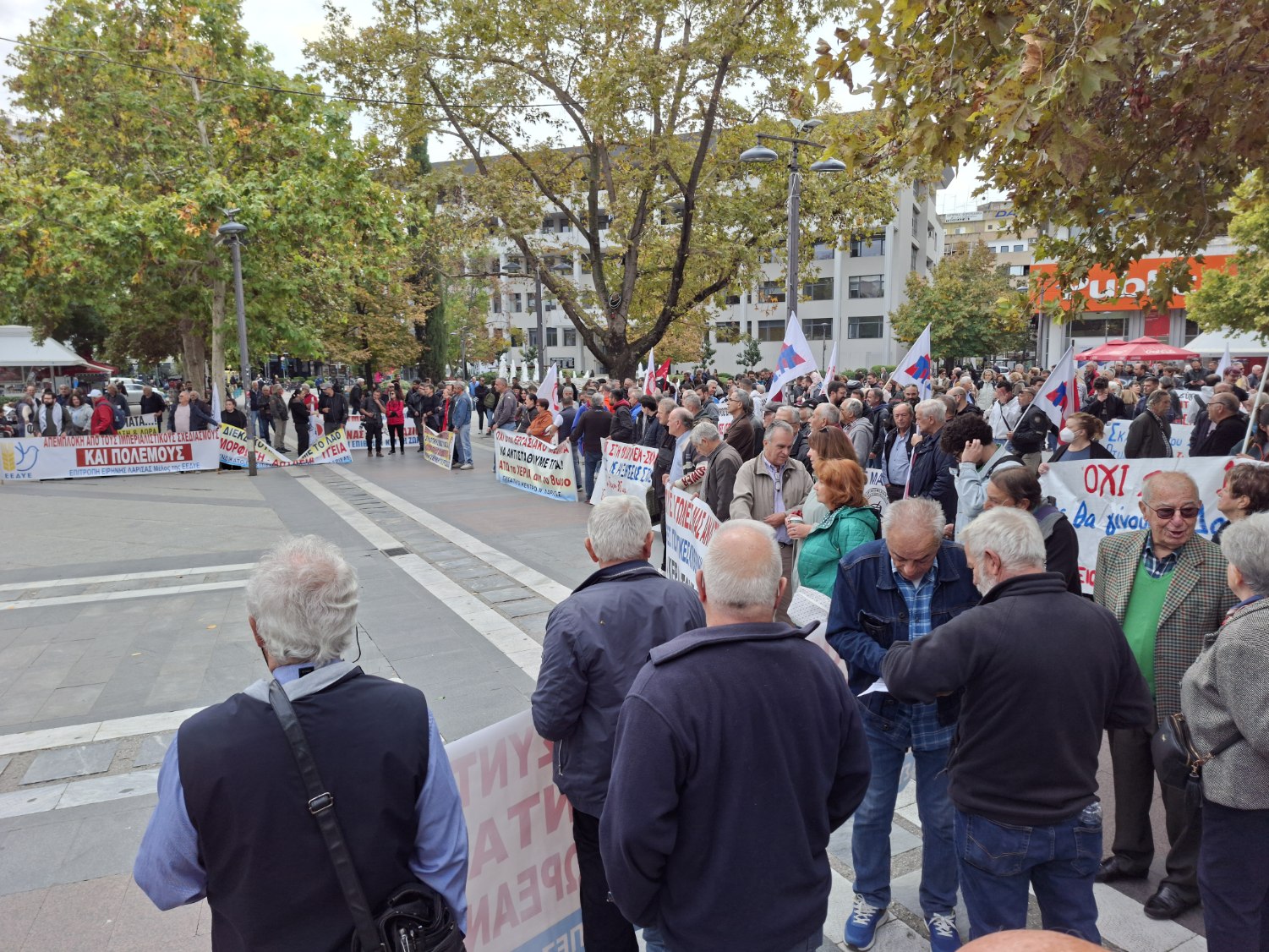 Η Συγκέντρωση διαμαρτυρίας πραγματοποιήθηκε στην Κεντρική πλατεία με την συμμετοχή του Εργατικού Κέντρου Λάρισας, σωματείων και άλλων φορέων, όπως ο Σύλλογος Εκπαιδευτικών Πρωτοβάθμιας Εκπαίδευσης Ν. Λάρισας «Κωνσταντίνος Κούμας», το Σωματείο Συνταξιούχων ΙΚΑ Ν. Λάρισας, το Συνδικάτο Κλωστοϋφαντουργίας Ιματισμού και Δέρματος Ν. Λάρισας.