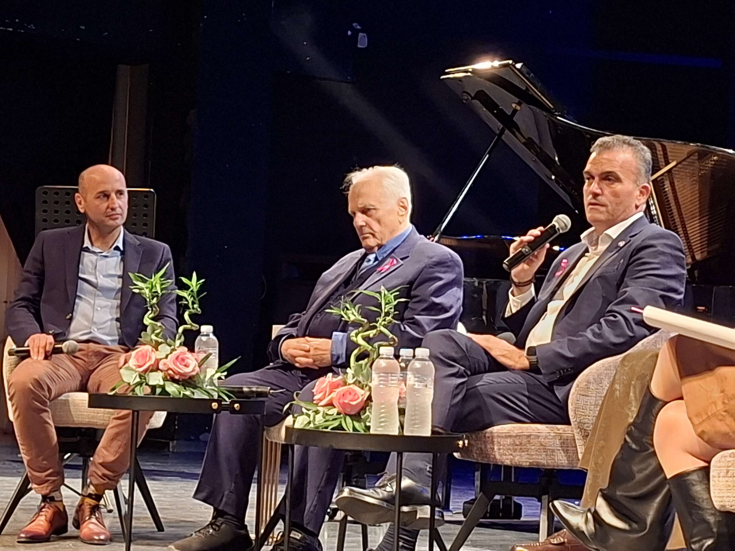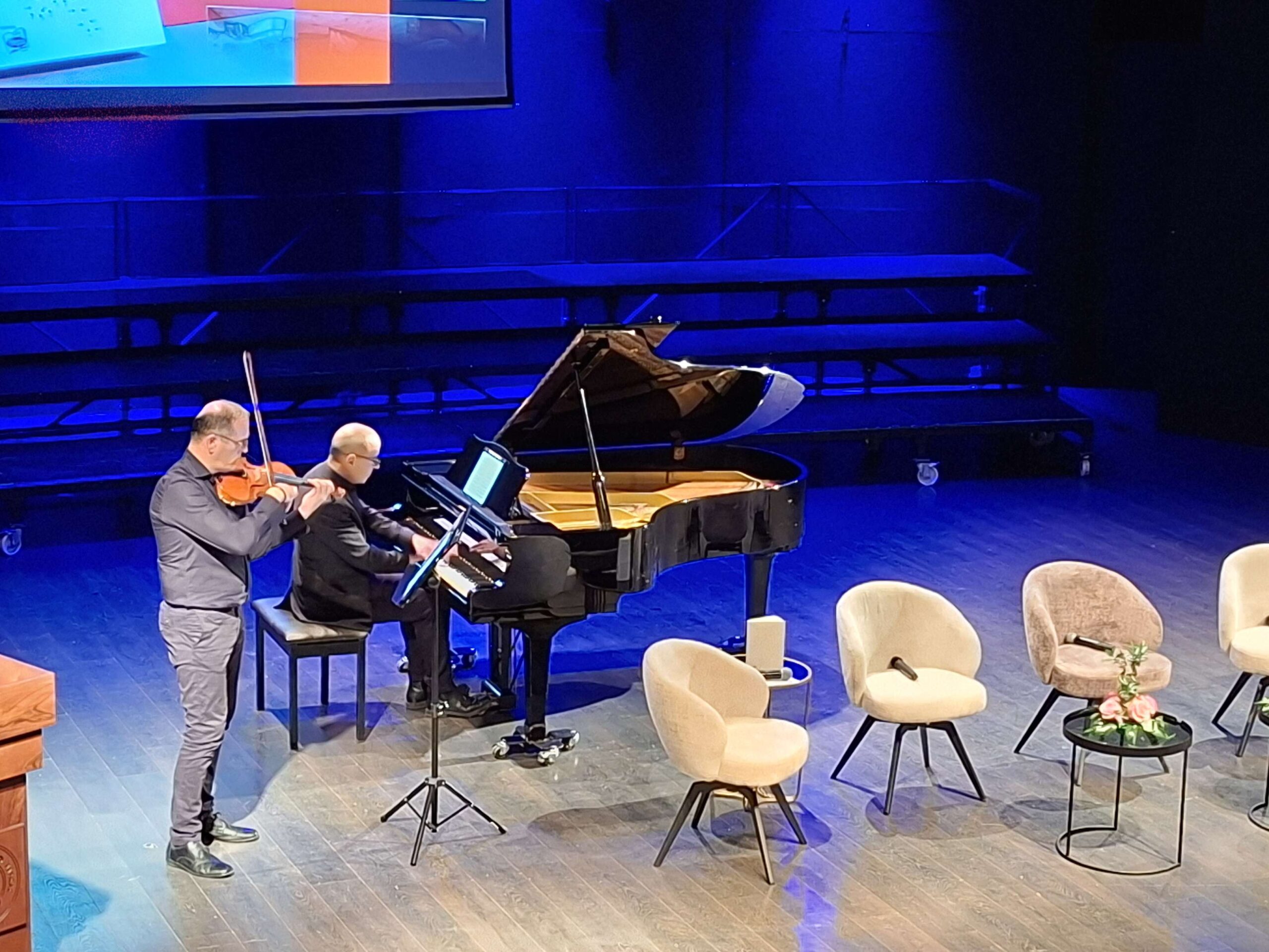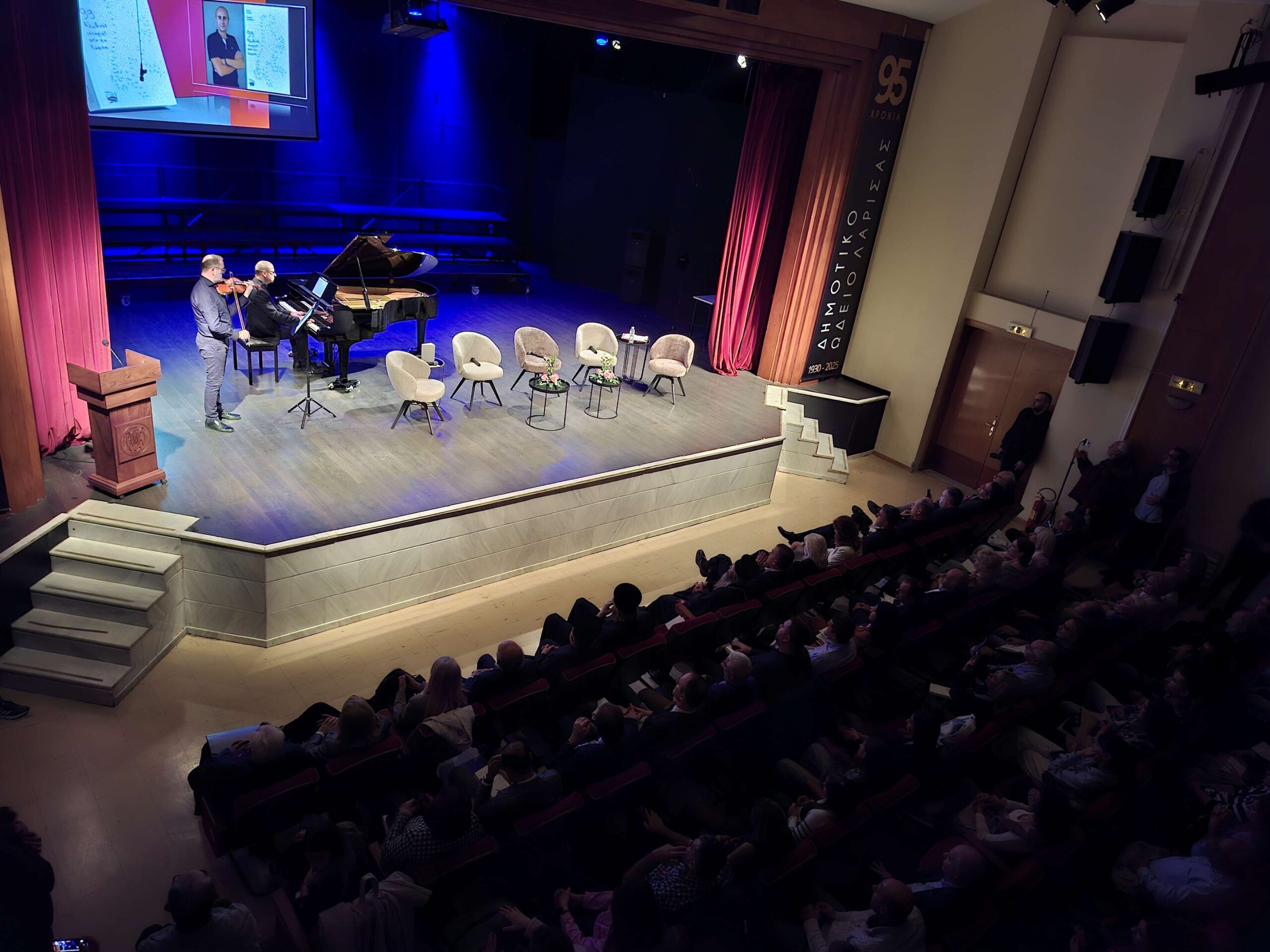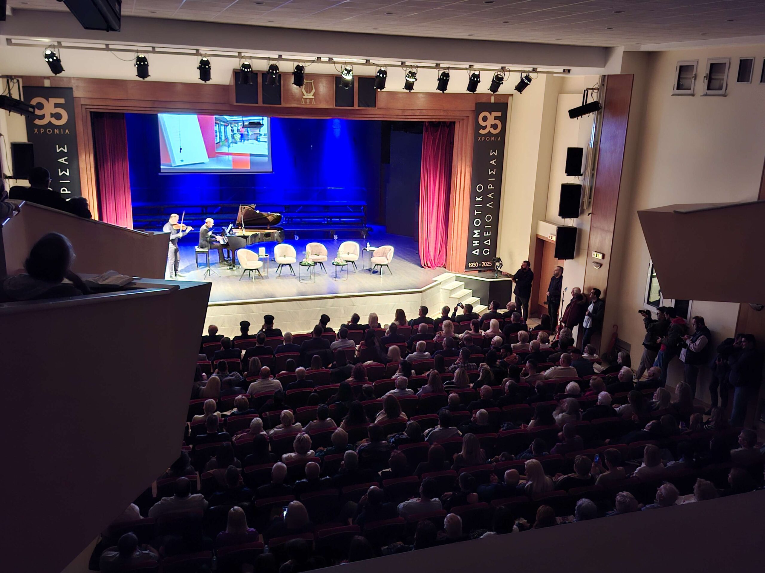 Η εκδήλωση ξεκίνησε με μουσικό ρεσιτάλ (διάρκειας 12’) με τον Διευθυντή του Δημοτικού Ωδείου Λάρισας, Χρήστο Λενούτσο στο πιάνο και τον Απόστολο Μητρά στο βιολί.