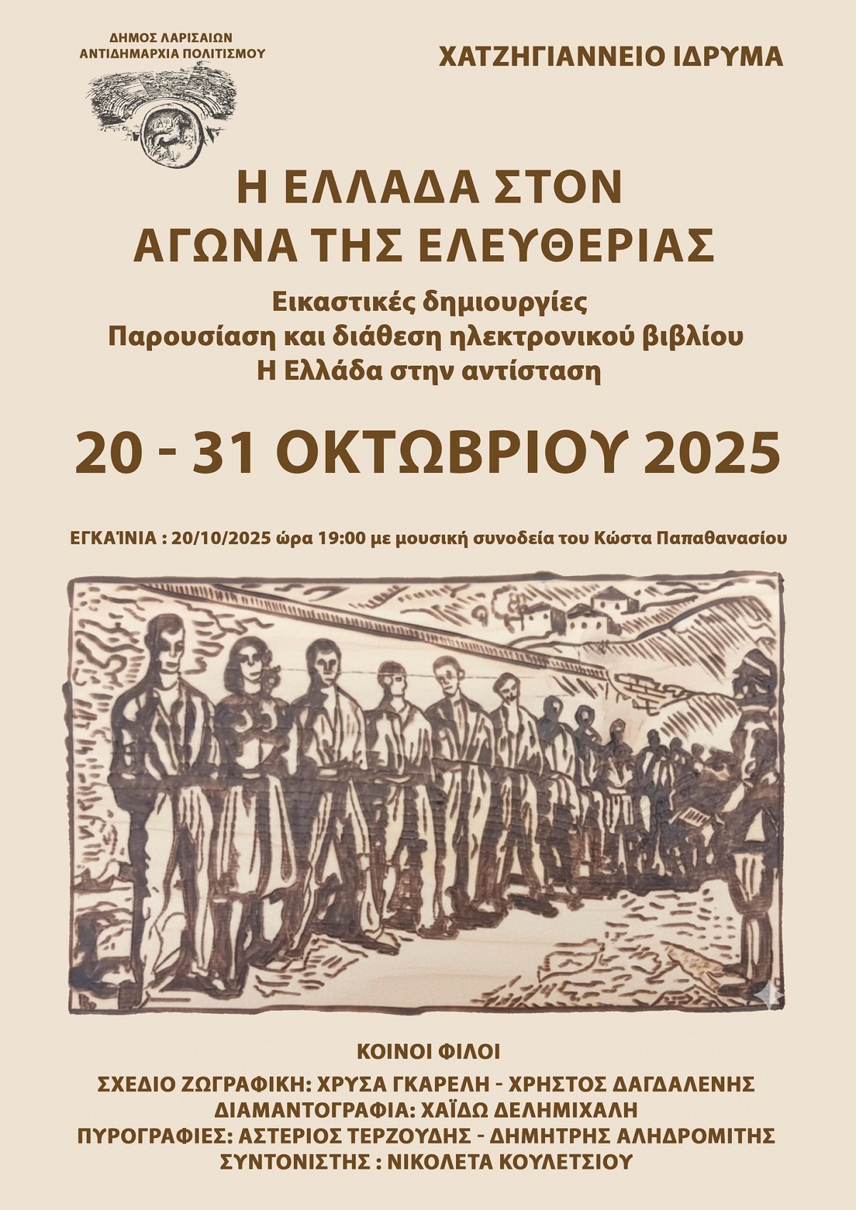 Μια ξεχωριστή βραδιά περιμένει το κοινό της Λάρισας τη Δευτέρα 20 Οκτωβρίου 2025, στο Χατζηγιάννειο Πνευματικό Κέντρο, όπου εγκαινιάζεται η εικαστική έκθεση «Η Ελλάδα στον Αγώνα της Ελευθερίας» της ομάδας «Κοινοί Φίλοι», σε συνδιοργάνωση με την Αντιδημαρχία Πολιτισμού του Δήμου Λαρισαίων.