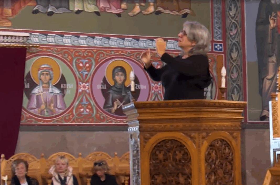 Η λειτουργία, που παρακολούθησαν περίπου 30 άτομα με προβλήματα ακοής αλλά και εκπαιδευόμενη στη νοηματική γλώσσα πραγματοποιήθηκε με διερμηνεία από την Επίκουρη Καθηγήτρια Γλωσσολογίας του Παιδαγωγικού Τμήματος Ειδικής Αγωγής του Πανεπιστημίου Θεσσαλίας, Γαλήνη Σαπουντζάκη, η οποία είναι και πιστοποιημένη διερμηνέας στη νοηματική.