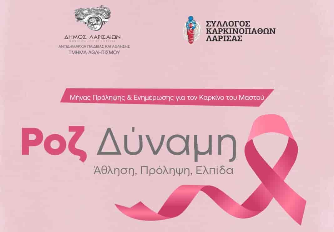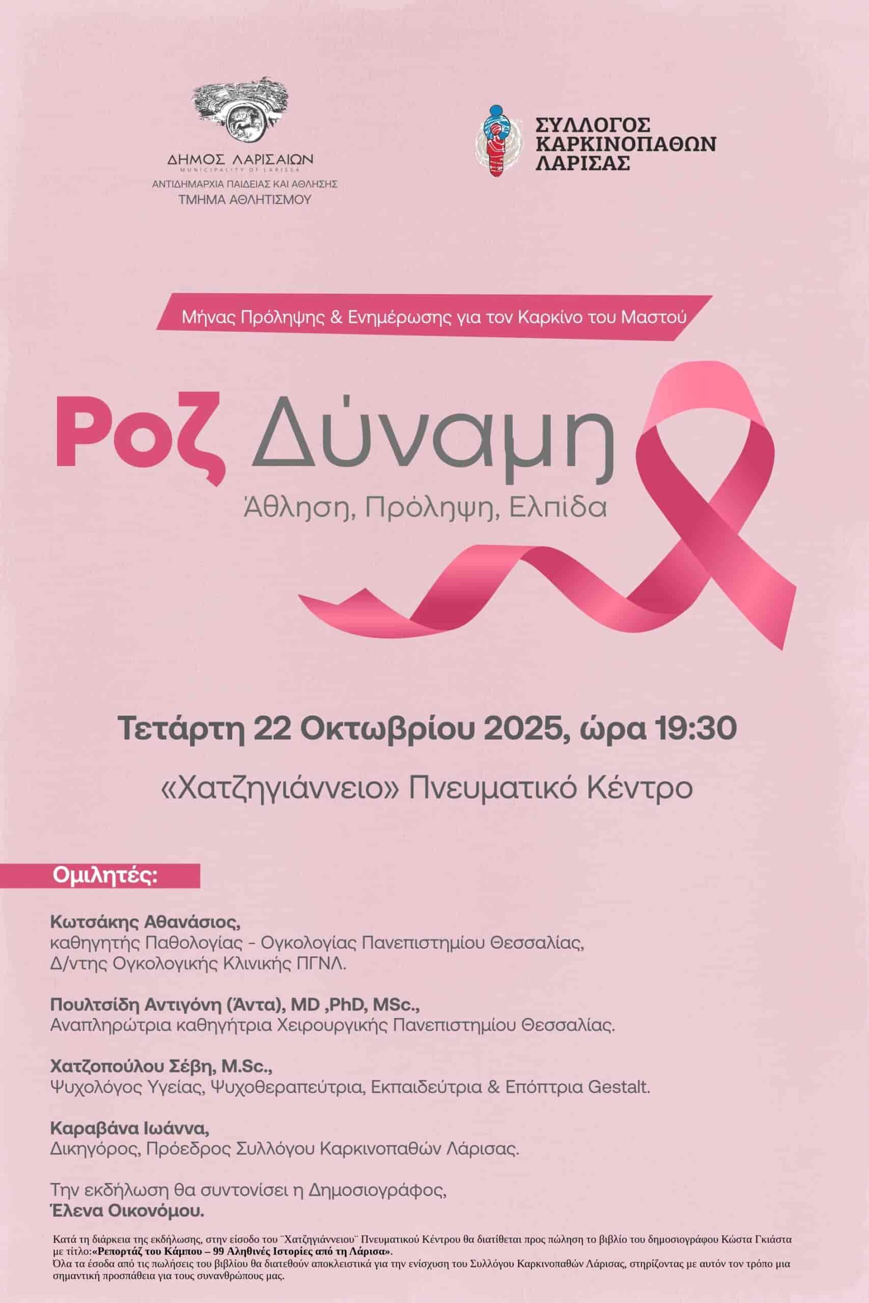Μια ξεχωριστή εκδήλωση, με τίτλο «Ροζ Δύναμη – Άθληση, Πρόληψη, Ελπίδα» διοργανώνει ο Δήμος Λαρισαίων και η Αντιδημαρχία Παιδείας & Άθλησης – Τμήμα Αθλητισμού, σε συνεργασία με τους καθηγητές Φυσικής Αγωγής του προγράμματος «Άθληση και Γυναίκα» και τον Σύλλογο Καρκινοπαθών Λάρισας, σήμερα, Τετάρτη 22 Οκτωβρίου 2025, στις 19:30, στο «Χατζηγιάννειο» Πνευματικό Κέντρο Λάρισας.