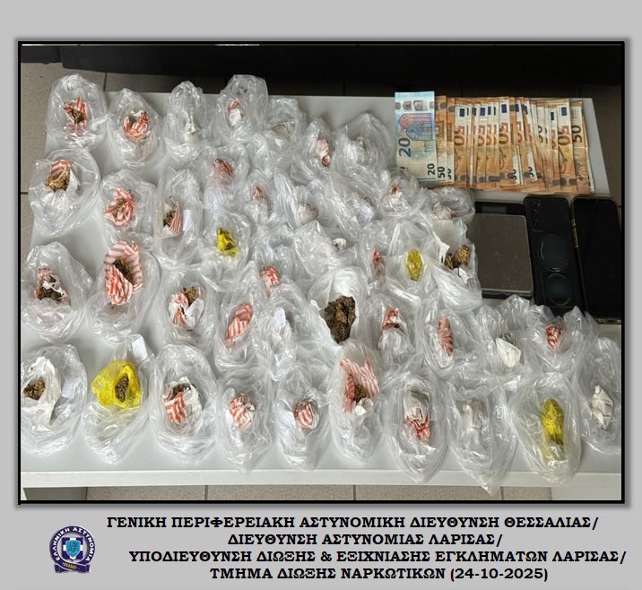 Συνελήφθησαν, χθες (23-10-2025) το μεσημέρι στη Λάρισα, από αστυνομικούς του Τμήματος Δίωξης Ναρκωτικών της Υποδιεύθυνσης Δίωξης και Εξιχνίασης Εγκλημάτων Λάρισας, -2- αλλοδαποί άνδρες, για παράβαση της νομοθεσίας περί ναρκωτικών.
