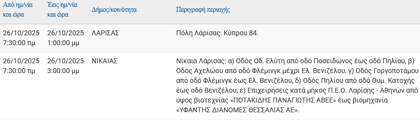 Σε προγραμματισμένες διακοπές ρεύματος προχωρά ο ΔΕΔΔΗΕ Α.Ε., σήμερα Κυριακή 26 Οκτωβρίου, σε περιοχές της Λάρισας και της Νίκαιας για να εκτελεσθούν απαραίτητες τεχνικές εργασίες στο δίκτυο.