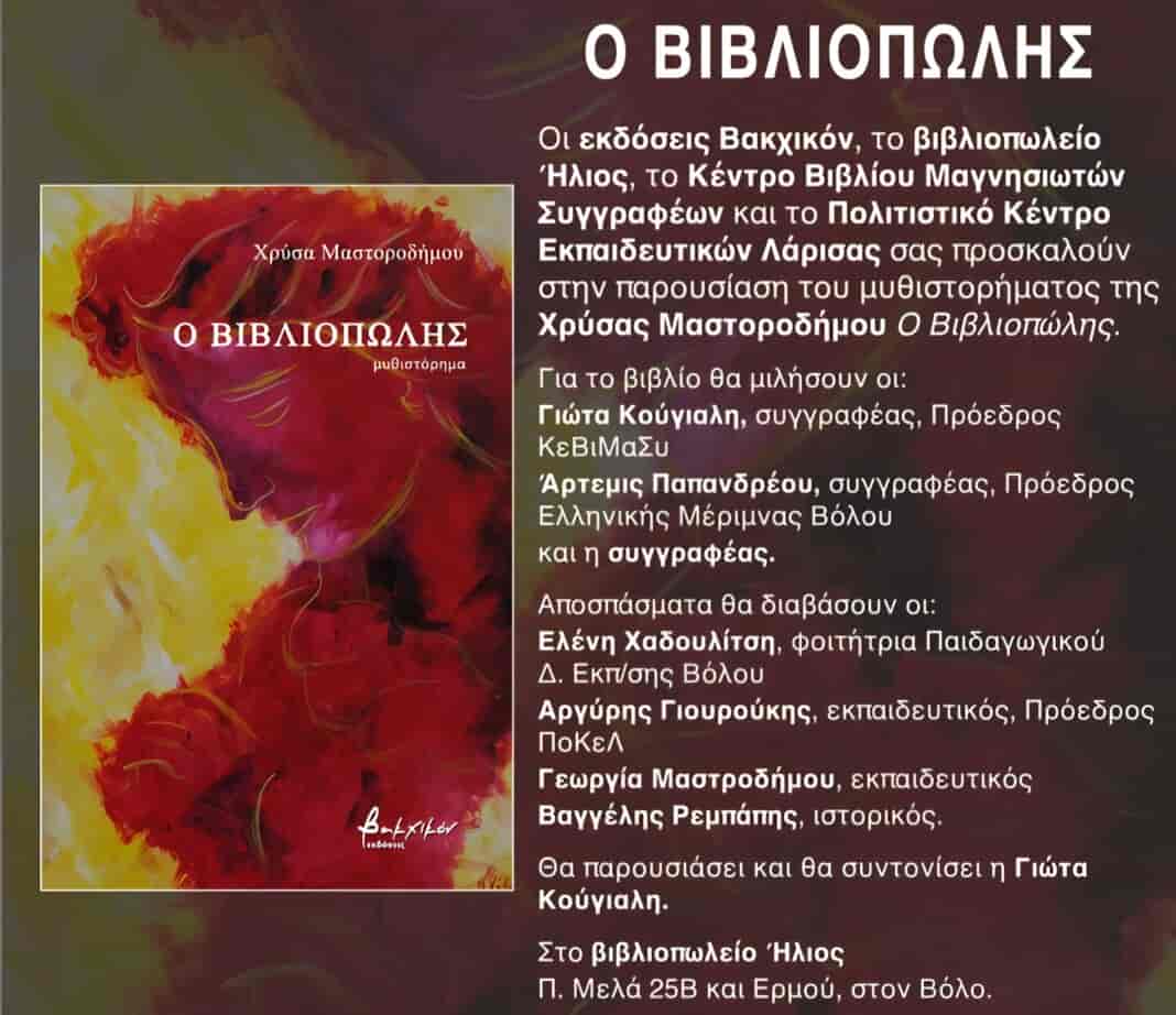 Το Πολιτιστικό Κέντρο Εκπαιδευτικών νομού Λάρισας – ΠΟΚΕΛ, οι εκδόσεις «Βακχικόν», το βιβλιοπωλείο «Ήλιος» και το ΚΕΒΙΜΑΣΥ (Κέντρο Βιβλίου Μαγνησιωτών Συγγραφέων) σας προσκαλούν στην παρουσίαση του νέου μυθιστορήματος της εκπαιδευτικού Χρύσας Μαστοροδήμου «Ο βιβλιοπώλης», την Πέμπτη, 30 Οκτωβρίου 2025 και ώρα 7:00 μ.μ. στο βιβλιοπωλείο Ήλιος, στον Βόλο (Π. Μελά 25β και Ερμού, Βόλος, τηλέφ. 2421076424) με ελεύθερη είσοδο.