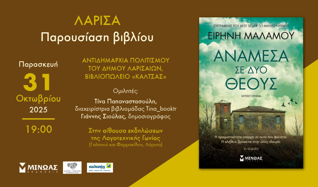 Το νέο βιβλίο της Ειρήνης Μαλάμου με τίτλο “Ανάμεσα σε δύο Θεούς”, παρουσιάζεται την Παρασκευή 31 Οκτωβρίου 2025, στις 19:00, στη Λογοτεχνική Γωνία ( Γαληνού και Φαρμακίδου) στη Λάρισα, από την Αντιδημαρχία Πολιτισμού του Δήμου Λαρισαίων, τις εκδόσεις ΜΙΝΩΑΣ  και το βιβλιοπωλείο “Καλτσάς”.