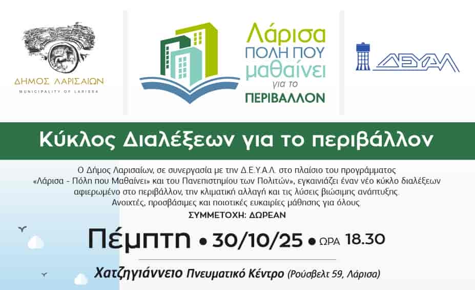 Η Αντιδημαρχία Παιδείας & Άθλησης, σε συνεργασία με την Δημοτική Επιχείρηση ΄Υδρευσης και Αποχέτευσης Λάρισας στο πλαίσιο του προγράμματος «Λάρισα – Πόλη που Μαθαίνει» και του Πανεπιστημίου των Πολιτών», εγκαινιάζει έναν νέο κύκλο διαλέξεων αφιερωμένο στο περιβάλλον, την κλιματική αλλαγή και τις λύσεις βιώσιμης ανάπτυξης.