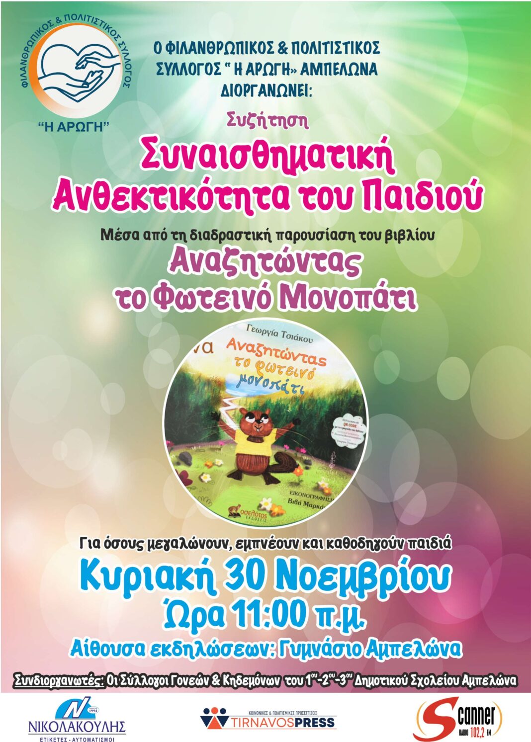 Ο Φιλανθρωπικός και Πολιτιστικός Σύλλογος «H ΑΡΩΓΗ» Αμπελώνα συνδιοργανώνει με τους Συλλόγους Γονέων και Κηδεμόνων των 1ο, 2ο και 3ο Δημοτικών Σχολείων Αμπελώνα, και σας προσκαλούν σε μία ξεχωριστή και βιωματική εκδήλωση που θα πραγματοποιηθεί την Κυριακή 30 Νοεμβρίου 11:00 π.μ στην αίθουσα εκδηλώσεων του Γυμνασίου Αμπελώνα Λάρισας.
